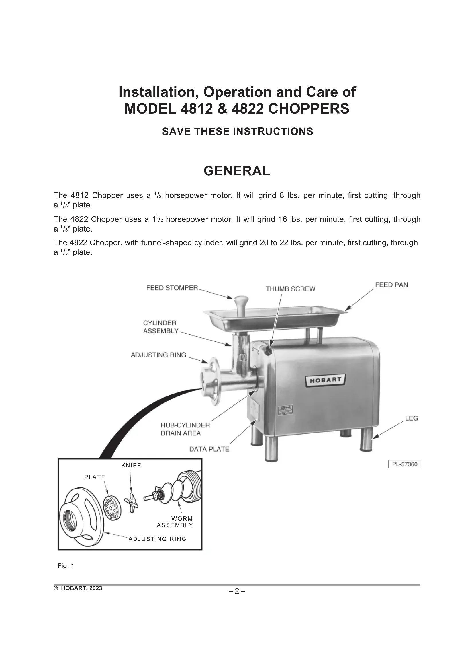 Hub Drain A drain slot in the trim washer allows any meat juices to drain from the hub. This slot should be inspected periodically to make sure that it is free of obstructions. A small brush can be used to remove any material which may have accumulated. Cylinder Drain A drain hole at the bottom end of the cylinder allows any meat juices to drain. This hole should be inspected periodically to make sure that it is free of obstructions. A small wire can be used to remove any material which may have accumulated. AIR INTAKE Under normal operating conditions the motor air intake screen, located in the base of the chopper, will need little or no attention. However, in some installations where sawdust or other foreign materials are present in the air, this intake screen may become partially or completely covered. Where an adverse dust condition does exist, periodically check the screen and wipe clean with a rag or brush as required. STORAGE The chopper should be completely cleaned and covered with a towel or other suitable cover when it is not to be used in the immediate future. SERVICE Contact your local Hobart authorized service oce for any repairs or adjustments needed on this equipment. OPERATION Cut the meat into strips, turn the machine ON and feed the meat strips into the chopper, using the feed stomper only as needed. If the strips are cut to proper size, they will feed without assistance from the feed stomper, allowing both hands of the operator free to feed meat. When running meat through the chopper a second time, more speed is attained by feeding small quantities at a time than by trying to force large amounts with the feed stomper. The feed pan should always be kept in place on the cylinder. It not only makes regular feeding easy, but keeps the chopper attachment ready for immediate use. The neness to which the meat is cut is governed by the size of the holes in the perforated plate, not by the tension put on the adjusting ring. Do not tighten the adjusting ring more than hand tight. FORM 35109 Rev. C (April 2023) PRINTED IN U.S.A.701 S. RIDGE AVENUETROY, OHIO 45373937 332-3000 www.hobartcorp.com FORMULARIO 35109 Rev. C (Abril 2023) PICADORAS 4812 Y 4822 MODELO 4812 ML-136151 ML-136152 4822 ML-136125 ML-136126