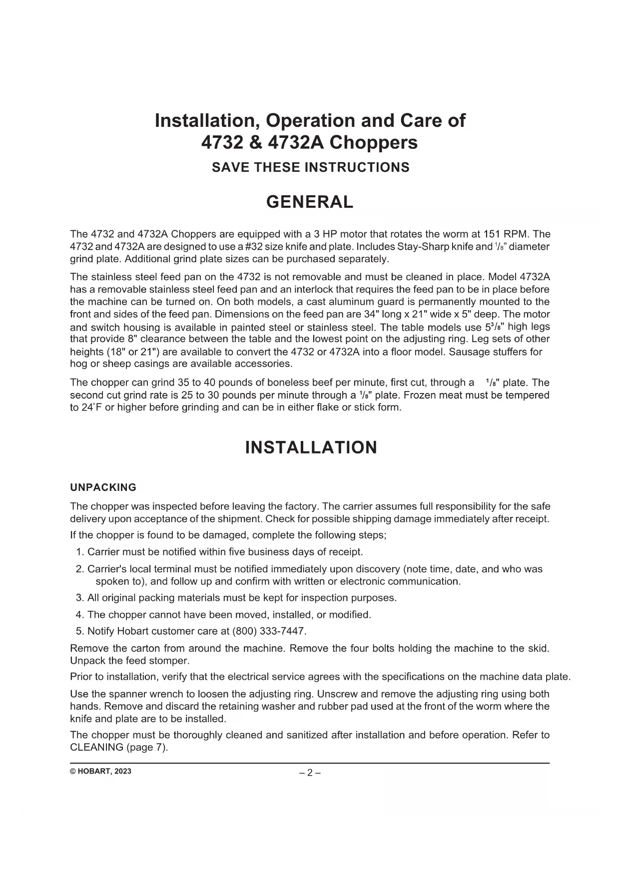 F or higher before grinding and can be in either ake or stick form. INSTALLATION UNPACKING The chopper was inspected before leaving the factory. The carrier assumes full responsibility for the safe delivery upon acceptance of the shipment. Check for possible shipping damage immediately after receipt. If the chopper is found to be damaged, complete the following steps;