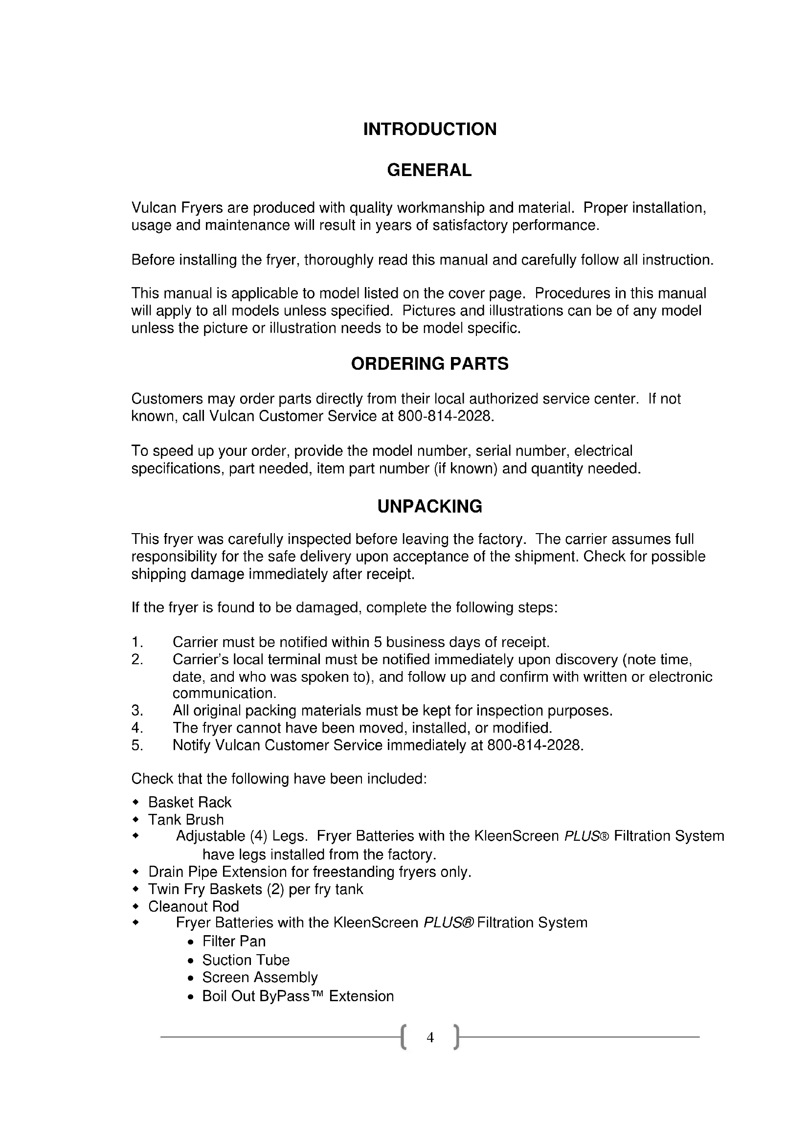 MAINTENANCE………………………………………………………….. 26 Service in the US and Canada…………………………………... 26 In Australia…………………………………………………………. 26 TROUBLESHOOTING…………………………………………………….. 26 Troubleshooting Chart………………………………………………. 264 INTRODUCTION GENERAL Vulcan Fryers are produced with quality workmanship and material. Proper installation, usage and maintenance will result in years of satisfactory performance. Before installing the fryer, thoroughly read this manual and carefully follow all instruction. This manual is applicable to model listed on the cover page. Procedures in this manual will apply to all models unless specified. Pictures and illustrations can be of any model unless the picture or illustration needs to be model specific. ORDERING PARTS Customers may order parts directly from their local authorized service center. If not known, call Vulcan Customer Service at 800-814-2028. To speed up your order, provide the model number, serial number, electrical specifications, part needed, item part number (if known) and quantity needed. UNPACKING This fryer was carefully inspected before leaving the factory. The carrier assumes full responsibility for the safe delivery upon acceptance of the shipment. Check for possible shipping damage immediately after receipt. If the fryer is found to be damaged, complete the following steps: