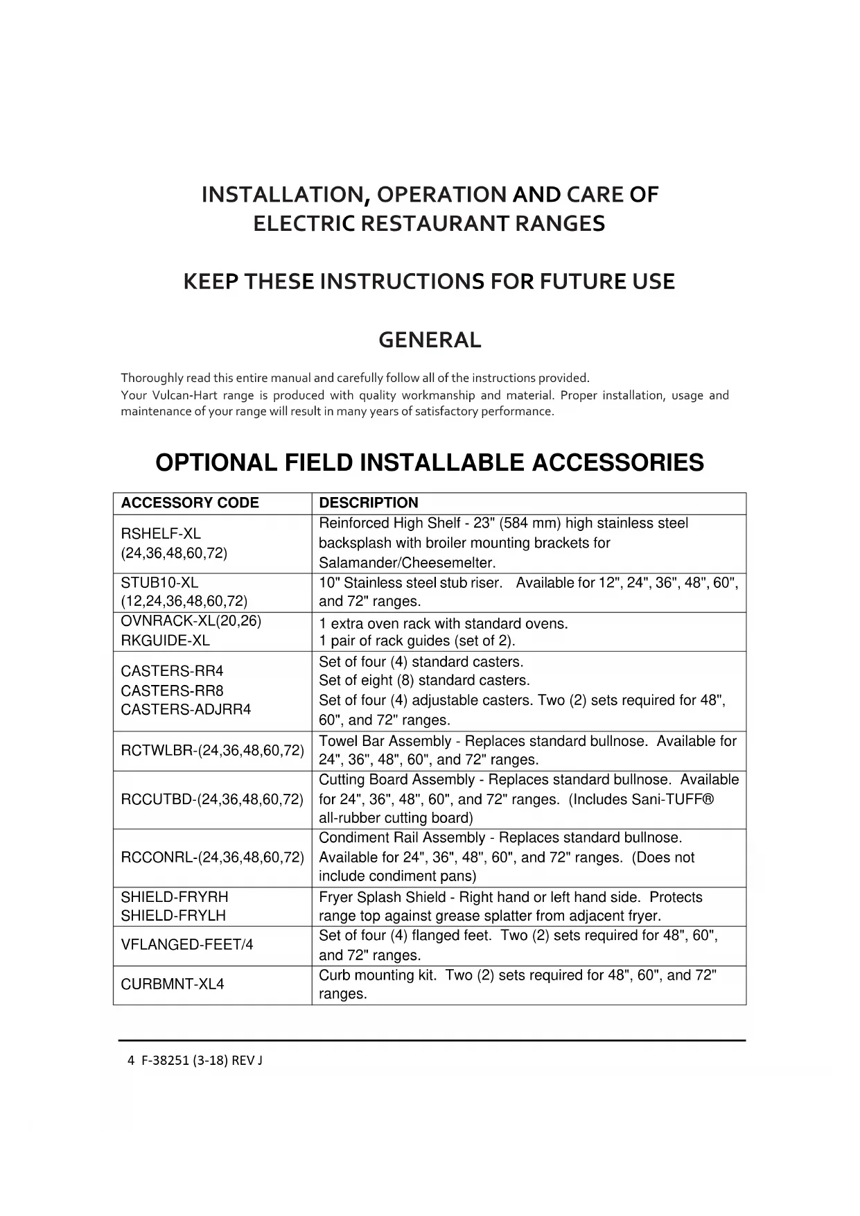 ACCESSORY CODE DESCRIPTION RSHELF-XL (24,36,48,60,72) Reinforced High Shelf - 23" (584 mm) high stainless steel backsplash with broiler mounting brackets for Salamander/Cheesemelter. STUB10-XL (12,24,36,48,60,72) 10" Stainless steel stub riser. Available for 12", 24", 36", 48", 60", and 72" ranges. OVNRACK-XL(20,26) RKGUIDE-XL 1 extra oven rack with standard ovens. 1 pair of rack guides (set of 2). CASTERS-RR4 CASTERS-RR8 CASTERS-ADJRR4 Set of four (4) standard casters. Set of eight (8) standard casters. Set of four (4) adjustable casters. Two (2) sets required for 48", 60", and 72" ranges. RCTWLBR-(24,36,48,60,72) Towel Bar Assembly - Replaces standard bullnose. Available for 24", 36", 48", 60", and 72" ranges. RCCUTBD-(24,36,48,60,72) Cutting Board Assembly - Replaces standard bullnose. Available for 24", 36", 48", 60", and 72" ranges. (Includes Sani-TUFF® all-rubber cutting board) RCCONRL-(24,36,48,60,72) Condiment Rail Assembly - Replaces standard bullnose. Available for 24", 36", 48", 60", and 72" ranges. (Does not include condiment pans) SHIELD-FRYRH SHIELD-FRYLH Fryer Splash Shield - Right hand or left hand side. Protects range top against grease splatter from adjacent fryer. VFLANGED-FEET/4 Set of four (4) flanged feet. Two (2) sets required for 48", 60", and 72" ranges. CURBMNT-XL4 Curb mounting kit. Two (2) sets required for 48", 60", and 72" ranges.5 F-38251 (3-18) REV J INSTALLATION UNPACKING This range was inspected before leaving the factory. The transportation company assumes full responsibility for safe delivery upon acceptance of the shipment. Immediately after unpacking, check for possible shipping damage. If the range is found to be damaged, save the packaging material and contact the carrier immediately. Remove all shipping bands, blocking, and packaging. Remove the high shelf, and backsplash assembly. Before installing, verify that the electrical service agrees with the specifications on the rating plate located behind the kick panel on the left side. If the supply and equipment requirements do not agree, contact your dealer or Vulcan-Hart immediately. If it is required to remove the door and install it for access through a kitchen door, follow the instructions below. Door removal