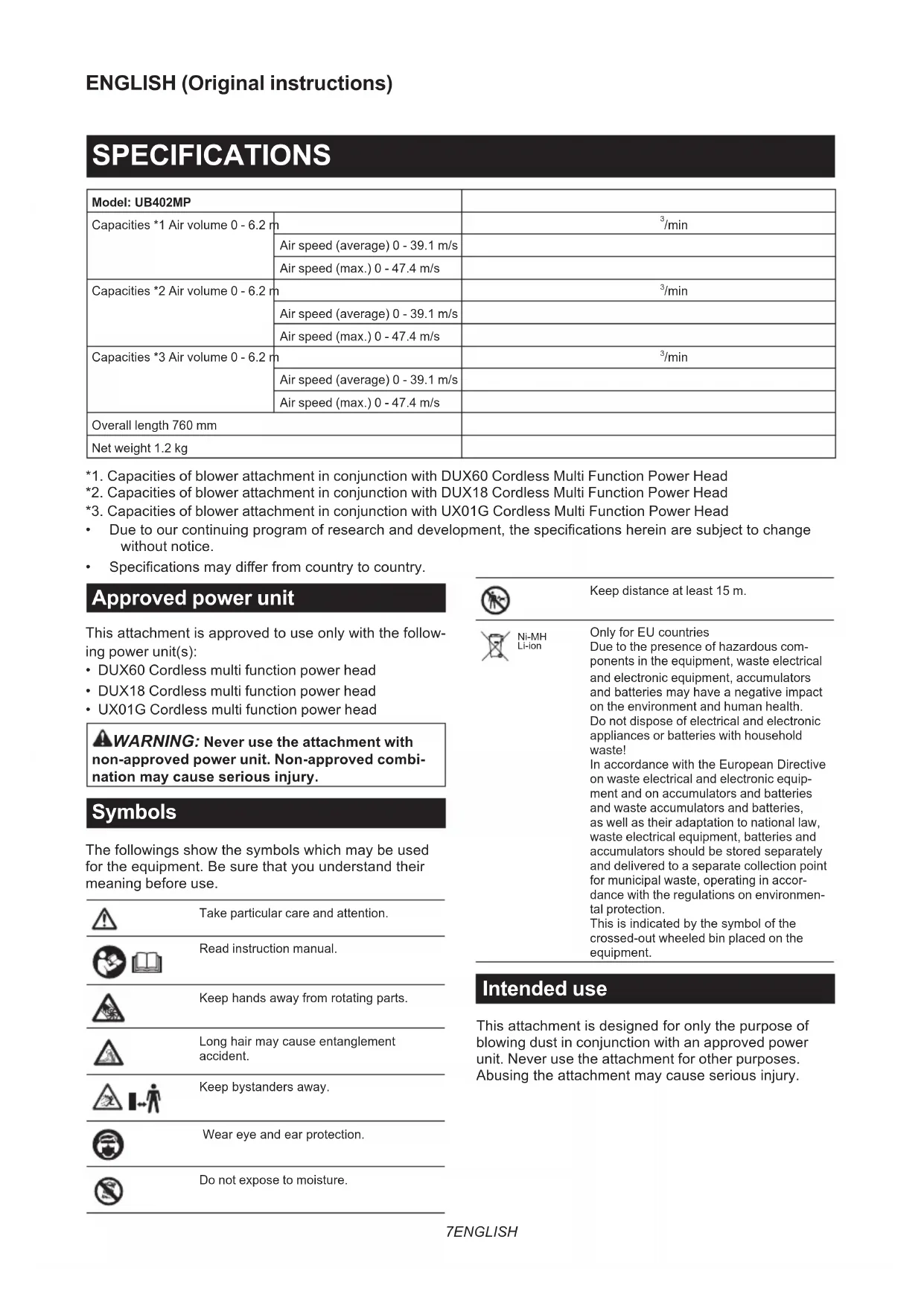 non-approved power unit. Non-approved combi- nation may cause serious injury. Symbols Thefollowingsshowthesymbolswhichmaybeused fortheequipment.Besurethatyouunderstandtheir meaning before use. Take particular care and attention. Read instruction manual. Keephandsawayfromrotatingparts. Longhairmaycauseentanglement accident. Keepbystandersaway. Weareyeandearprotection. Do not expose to moisture. Keep distance at least 15 m. Ni-MH Li-ion OnlyforEUcountries Due to the presence of hazardous com- ponents in the equipment, waste electrical and electronic equipment, accumulators andbatteriesmayhaveanegativeimpact on the environment and human health. Do not dispose of electrical and electronic appliances or batteries with household waste! InaccordancewiththeEuropeanDirective on waste electrical and electronic equip- ment and on accumulators and batteries and waste accumulators and batteries, as well as their adaptation to national law, waste electrical equipment, batteries and accumulatorsshouldbestoredseparately and delivered to a separate collection point for municipal waste, operating in accor- dance with the regulations on environmen- tal protection. Thisisindicatedbythesymbolofthe crossed-out wheeled bin placed on the equipment. Intended use Thisattachmentisdesignedforonlythepurposeof blowing dust in conjunction with an approved power unit. Never use the attachment for other purposes. Abusingtheattachmentmaycauseseriousinjury.8 ENGLISH EC Declaration of Conformity For European countries only We as the manufacturers: Makita Europe N.V., Business address: Jan-Baptist Vinkstraat 2 3070 Kortenberg BELGIUM. Authorize Hiroshi Tsujimura forthecompilationofthetechnicalleanddeclare underoursoleresponsibilitythattheproduct(s); Designation: Blower Attachment. Designation of Type(s):UB402MP. Fulllsalltherelevantprovisionsof2006/42/EC and alsofulllsalltherelevantprovisionsofthefollowing EC/EUDirectives:2000/14/EC and are manufactured in accordance with the following Harmonised Standards: EN 60335-1:2012+A11:2014+A13:2017+A1:2019+A14 :2019+A2:2019, EN 50636-2-100:2014. Place and date of declaration: Kortenberg, Belgium.