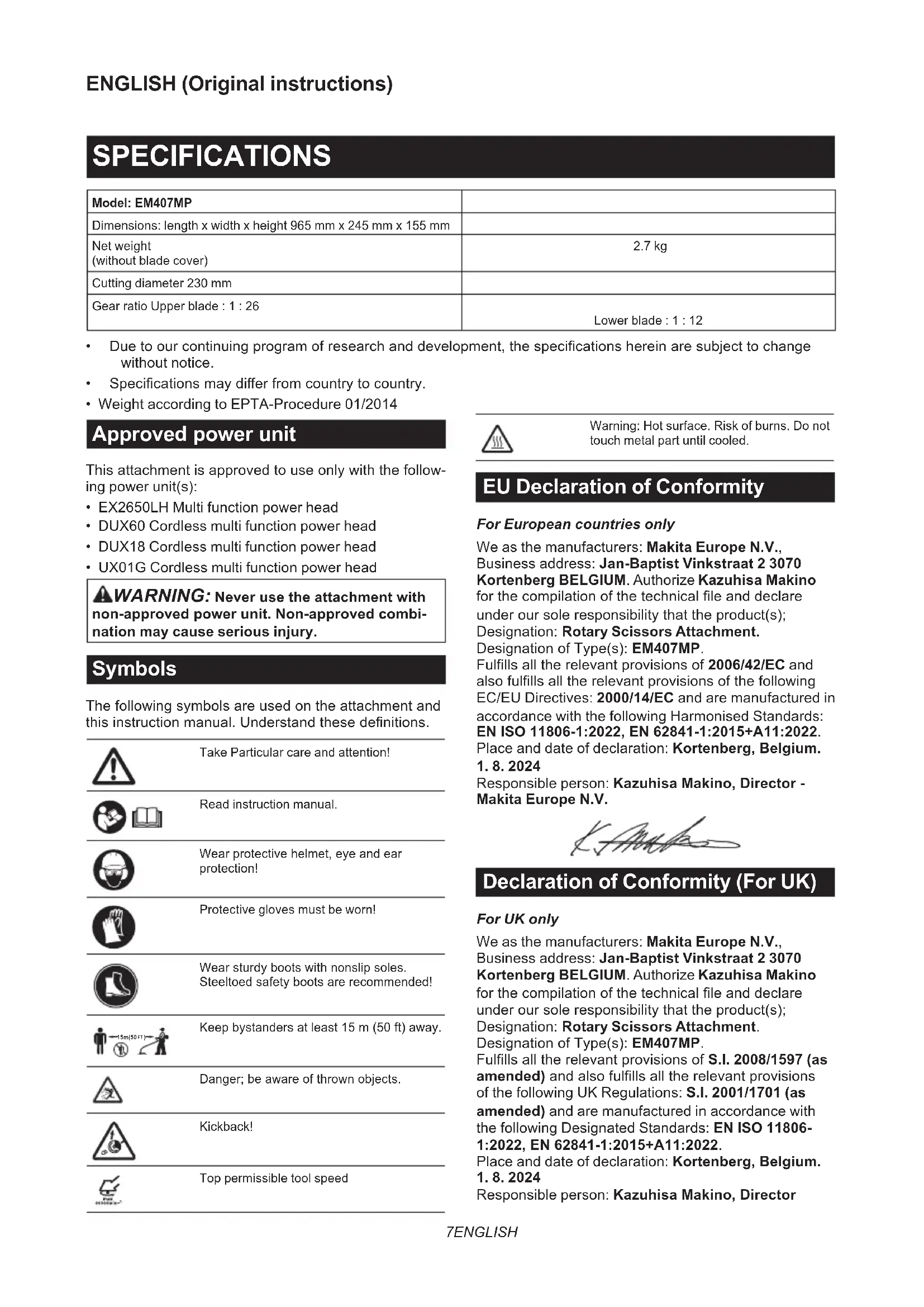 touch metal part until cooled. EU Declaration of Conformity For European countries only We as the manufacturers: Makita Europe N.V., Business address: Jan-Baptist Vinkstraat 2 3070 Kortenberg BELGIUM. Authorize Kazuhisa Makino forthecompilationofthetechnicalleanddeclare underoursoleresponsibilitythattheproduct(s); Designation: Rotary Scissors Attachment. DesignationofType(s):EM407MP. Fulllsalltherelevantprovisionsof2006/42/EC and alsofulllsalltherelevantprovisionsofthefollowing EC/EU Directives: 2000/14/EC and are manufactured in accordance with the following Harmonised Standards: EN ISO 11806-1:2022, EN 62841-1:2015+A11:2022. Place and date of declaration: Kortenberg, Belgium.