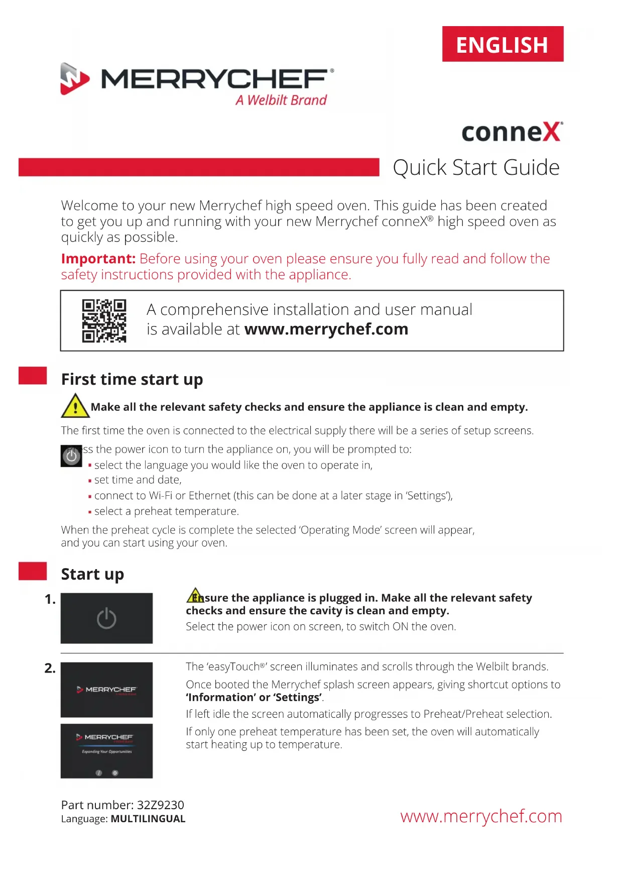 Ensure the appliance is plugged in. Make all the relevant safety checks and ensure the cavity is clean and empty.Select the power icon on screen, to switch ON the oven.The ‘easyTouch ’ screen illuminates and scrolls through the Welbilt brands.Once booted the Merrychef splash screen appears, giving shortcut options to ‘Information’ or ‘Settings’.If left idle the screen automatically progresses to Preheat/Preheat selection.If only one preheat temperature has been set, the oven will automatically start heating up to temperature. www.merrychef.com ENGLISH Part number: 32Z9230 Language: MULTILINGUAL3.