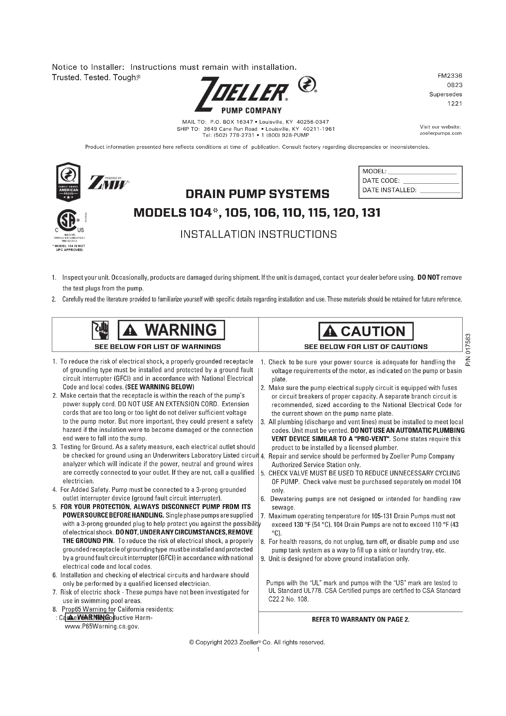 When making changes to this FM, be sure to also make changes to the Spanish and French version and also the FW0107 if the 104 pump is changed. Also, if the changes will aect the model 1104, FM2366 for Dayton will also be aected. 1. Inspect your unit. Occasionally, products are damaged during shipment. If the unit is damaged, contact your dealer before using. DO NOT remove the test plugs from the pump. 2. Carefully read the literature provided to familiarize yourself with specic details regarding installation and use. These materials should be retained for future reference. 1. To reduce the risk of electrical shock, a properly grounded receptacle of grounding type must be installed and protected by a ground fault circuit interrupter (GFCI) and in accordance with National Electrical Code and local codes. (SEE WARNING BELOW) 2. Make certain that the receptacle is within the reach of the pump’s power supply cord. DO NOT USE AN EXTENSION CORD. Extension cords that are too long or too light do not deliver sufcient voltage to the pump motor. But more important, they could present a safety hazard if the insulation were to become damaged or the connection end were to fall into the sump.3. Testing for Ground. As a safety measure, each electrical outlet should be checked for ground using an Underwriters Laboratory Listed circuit analyzer which will indicate if the power, neutral and ground wires are correctly connected to your outlet. If they are not, call a qualied electrician.4. For Added Safety. Pump must be connected to a 3-prong grounded outlet interrupter device (ground fault circuit interrupter).5. FOR YOUR PROTECTION, ALWAYS DISCONNECT PUMP FROM ITS POWER SOURCE BEFORE HANDLING. Single phase pumps are supplied with a 3-prong grounded plug to help protect you against the possibility of electrical shock. DO NOT, UNDER ANY CIRCUMSTANCES, REMOVE THE GROUND PIN. To reduce the risk of electrical shock, a properly grounded receptacle of grounding type must be installed and protected by a ground fault circuit interrupter (GFCI) in accordance with national electrical code and local codes.6. Installation and checking of electrical circuits and hardware should only be performed by a qualied licensed electrician. 7. Risk of electric shock - These pumps have not been investigated for use in swimming pool areas.8. Prop65 Warning for California residents: : Cancer and Reproductive Harm- www.P65Warning.ca.gov.1. Check to be sure your power source is adequate for handling the voltage requirements of the motor, as indicated on the pump or basin plate. 2. Make sure the pump electrical supply circuit is equipped with fuses or circuit breakers of proper capacity. A separate branch circuit is recommended, sized according to the National Electrical Code for the current shown on the pump name plate. 3. All plumbing (discharge and vent lines) must be installed to meet local codes. Unit must be vented. DO NOT USE AN AUTOMATIC PLUMBING VENT DEVICE SIMILAR TO A "PRO-VENT". Some states require this product to be installed by a licensed plumber.4. Repair and service should be performed by Zoeller Pump Company Authorized Service Station only.5. CHECK VALVE MUST BE USED TO REDUCE UNNECESSARY CYCLING OF PUMP. Check valve must be purchased separately on model 104 only. 6. Dewatering pumps are not designed or intended for handling raw sewage. 7. Maximum operating temperature for 105-131 Drain Pumps must not exceed 130 °F (54 °C). 104 Drain Pumps are not to exceed 110 °F (43 °C). 8. For health reasons, do not unplug, turn off, or disable pump and use pump tank system as a way to ll up a sink or laundry tray, etc.9. Unit is designed for above ground installation only.SEE BELOW FOR LIST OF WARNINGS CAUTION SEE BELOW FOR LIST OF CAUTIONSREFER TO WARRANTY ON PAGE 2. Pumps with the “UL” mark and pumps with the “US” mark are tested to UL Standard UL778. CSA Certified pumps are certified to CSA Standard C22.2 No. 108. Product information presented here reflects conditions at time of publication. Consult factory regarding discrepancies or inconsistencies. MAIL TO: P.O. BOX 16347 • Louisville, KY 40256-0347SHIP TO: 3649 Cane Run Road • Louisville, KY 40211-1961Tel: (502) 778-2731 • 1 (800) 928-PUMP Visit our website:zoellerpumps.com Trusted. Tested. Tough.