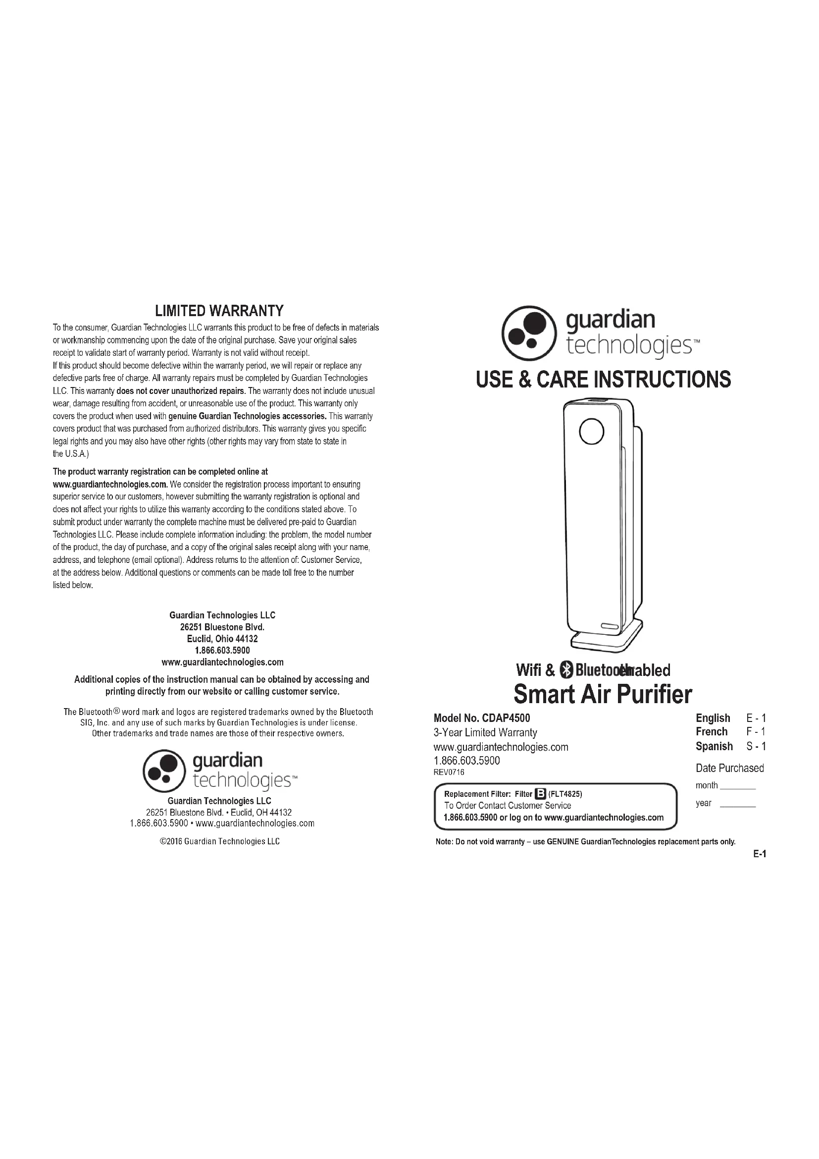 Replacement Filter: Filter (FLT4825)To Order Contact Customer Service1.866.603.5900 or log on to www.guardiantechnologies.com English E - 1French F - 1Spanish S - 1Date Purchasedmonth ________year ________©2016 Guardian Technologies LLCGuardian Technologies LLC26251 Bluestone Blvd. • Euclid, OH 441321.866.603.5900 • www.guardiantechnologies.com LIMITED WARRANTY To the consumer, Guardian Technologies LLC warrants this product to be free of defects in materials or workmanship commencing upon the date of the original purchase. Save your original salesreceipt to validate start of warranty period. Warranty is not valid without receipt.If this product should become defective within the warranty period, we will repair or replace anydefective parts free of charge. All warranty repairs must be completed by Guardian Technologies LLC. This warranty does not cover unauthorized repairs. The warranty does not include unusual wear, damage resulting from accident, or unreasonable use of the product. This warranty only covers the product when used with genuine Guardian Technologies accessories. This warranty covers product that was purchased from authorized distributors. This warranty gives you specificlegal rights and you may also have other rights (other rights may vary from state to state inthe U.S.A.)The product warranty registration can be completed online at www.guardiantechnologies.com. We consider the registration process important to ensuring superior service to our customers, however submitting the warranty registration is optional anddoes not affect your rights to utilize this warranty according to the conditions stated above. Tosubmit product under warranty the complete machine must be delivered pre-paid to GuardianTechnologies LLC. Please include complete information including: the problem, the model numberof the product, the day of purchase, and a copy of the original sales receipt along with your name,address, and telephone (email optional). Address returns to the attention of: Customer Service,at the address below. Additional questions or comments can be made toll free to the numberlisted below.Guardian Technologies LLC26251 Bluestone Blvd.Euclid, Ohio 441321.866.603.5900www.guardiantechnologies.comAdditional copies of the instruction manual can be obtained by accessing andprinting directly from our website or calling customer service. Wifi & enabled The Bluetooth word mark and logos are registered trademarks owned by the BluetoothSIG, Inc. and any use of such marks by Guardian Technologies is under license.Other trademarks and trade names are those of their respective owners. Note: Do not void warranty – use GENUINE GuardianTechnologies replacement parts only.READ AND SAVE THESE INSTRUCTIONS WARNINGS Failure to comply with the warnings listed below may result in electric shock or serious injury. This product should be used only in accordance with the specifications outlined in this manual. Usage other than what has been specified here may result in serious injury. When using electrical appliances, basic precautions should always be followed to reduce the risk of fire, electric shock and injury to persons, including the following: