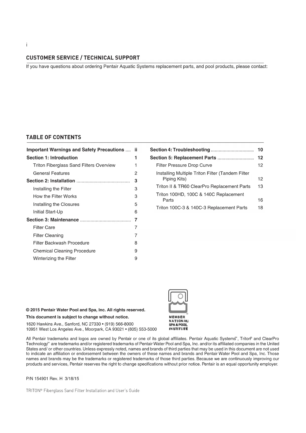 Series Fiberglass Sand Filters. Consult Pentair Water Pool and Spa, Inc. with any questions regarding this equipment. Attention Installer: This guide contains important information about the installation, operation and safe usage of this product. This information should be given to the owner and/or operator of this equipment after installation or left on or near the filter. Attention User: This manual contains important information that will help you in operating and maintaining this filter. Please retain it for future reference. Before installing this product, read and follow all warning notices and instructions which are included. Failure to follow safety warnings and instructions can result in severe injury, death, or property damage. Call (800) 831-7133 for additional free copies of these instructions. iiTRITON