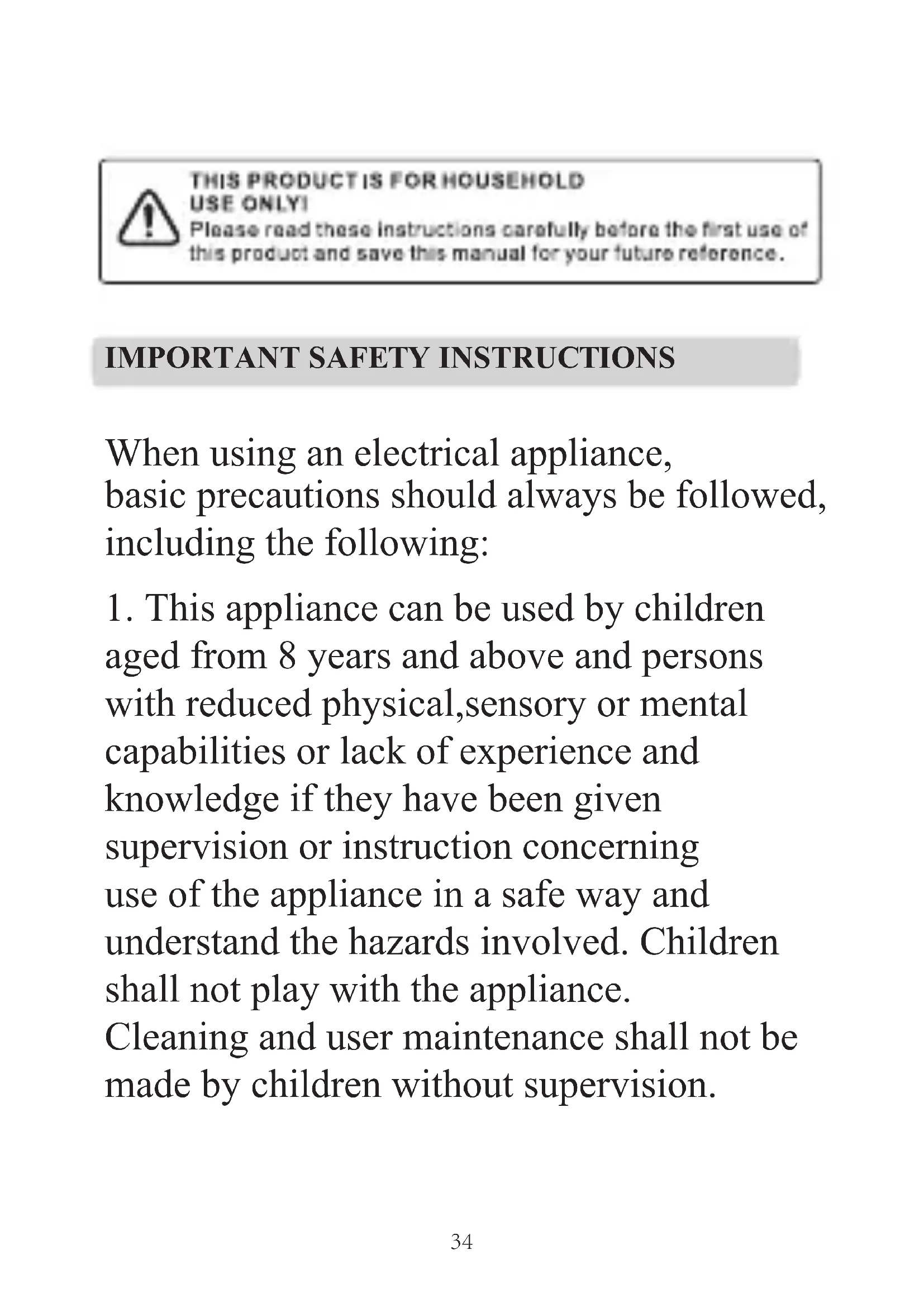aged from 8 years and above and persons with reduced physical,sensory or mental capabilities or lack of experience and knowledge if they have been given supervision or instruction concerning use of the appliance in a safe way and understand the hazards involved. Children shall not play with the appliance. Cleaning and user maintenance shall not be made by children without supervision.