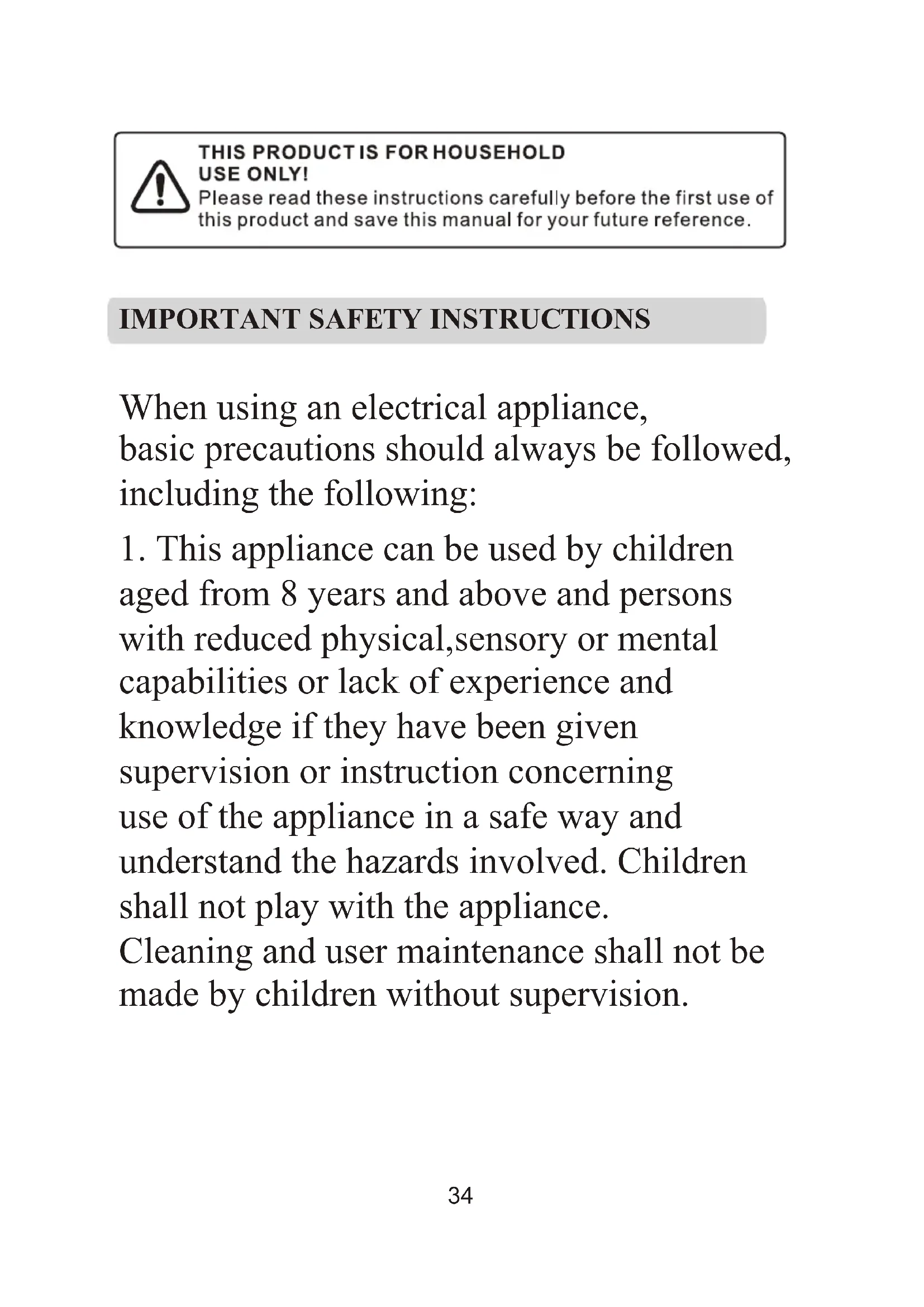 aged from 8 years and above and persons with reduced physical,sensory or mental capabilities or lack of experience and knowledge if they have been given supervision or instruction concerning use of the appliance in a safe way and understand the hazards involved. Children shall not play with the appliance. Cleaning and user maintenance shall not be made by children without supervision.