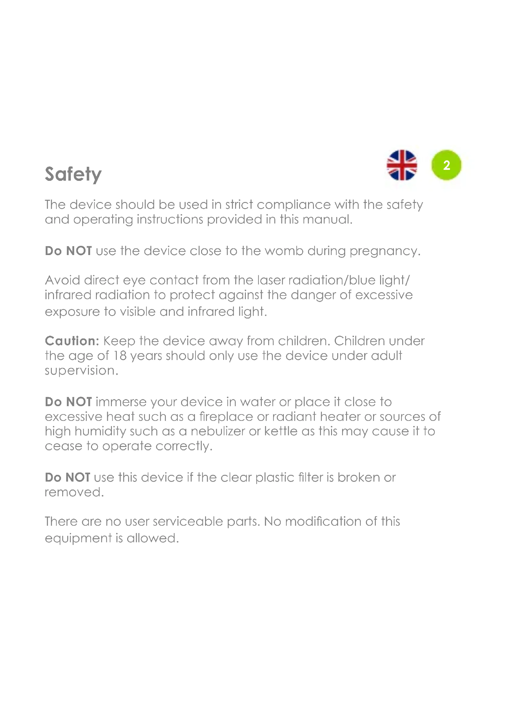Safety The device should be used in strict compliance with the safety and operating instructions provided in this manual. Do NOT use the device close to the womb during pregnancy. Avoid direct eye contact from the laser radiation/blue light/ infrared radiation to protect against the danger of excessive exposure to visible and infrared light. Caution: Keep the device away from children. Children under the age of 18 years should only use the device under adult supervision. Do NOT immerse your device in water or place it close to excessive heat such as a replace or radiant heater or sources of high humidity such as a nebulizer or kettle as this may cause it to cease to operate correctly. Do NOT use this device if the clear plastic lter is broken or removed. There are no user serviceable parts. No modication of this equipment is allowed.