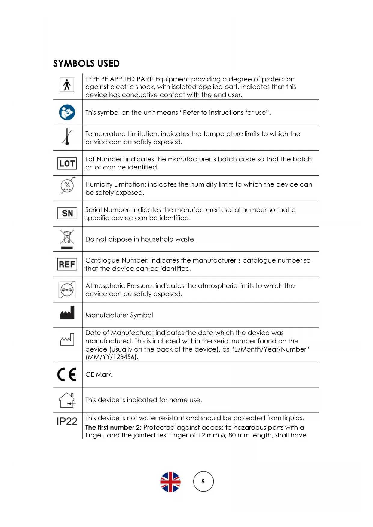 Temperature Limitation: indicates the temperature limits to which the device can be safely exposed. Lot Number: indicates the manufacturer’s batch code so that the batch or lot can be identified. Humidity Limitation: indicates the humidity limits to which the device can be safely exposed. Serial Number: indicates the manufacturer’s serial number so that a specific device can be identified. Do not dispose in household waste. Catalogue Number: indicates the manufacturer’s catalogue number so that the device can be identified. Atmospheric Pressure: indicates the atmospheric limits to which the device can be safely exposed. Manufacturer Symbol Date of Manufacture: indicates the date which the device was manufactured. This is included within the serial number found on the device (usually on the back of the device), as “E/Month/Year/Number” (MM/YY/123456). CE Mark This device is indicated for home use.