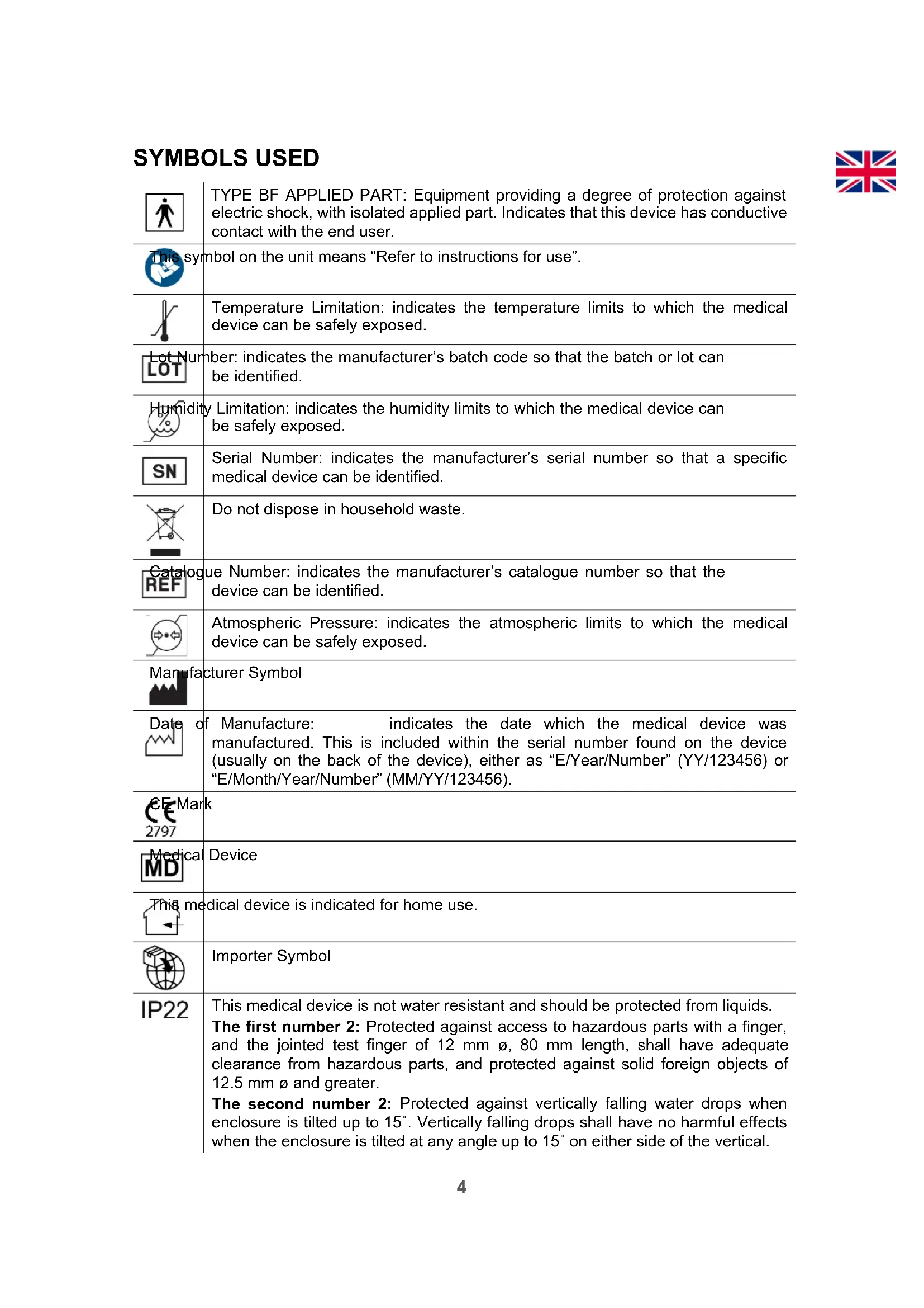 This symbol on the unit means “Refer to Instructions for use”. IP22 The unit is not water resistant, and should be protected from liquids.