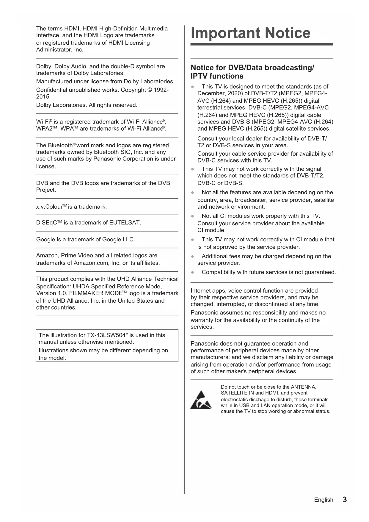 logo is a trademark of the UHD Alliance, Inc. in the United States and other countries. The illustration for TX-43LSW504* is used in this manual unless otherwise mentioned. Illustrations shown may be different depending on the model. Important Notice Notice for DVB/Data broadcasting/ IPTV functions ● This TV is designed to meet the standards (as of December, 2020) of DVB-T/T2 (MPEG2, MPEG4- AVC (H.264) and MPEG HEVC (H.265)) digital terrestrial services, DVB-C (MPEG2, MPEG4-AVC (H.264) and MPEG HEVC (H.265)) digital cable services and DVB-S (MPEG2, MPEG4-AVC (H.264) and MPEG HEVC (H.265)) digital satellite services. Consult your local dealer for availability of DVB-T/ T2 or DVB-S services in your area. Consult your cable service provider for availability of DVB-C services with this TV. ● This TV may not work correctly with the signal which does not meet the standards of DVB-T/T2, DVB-C or DVB-S. ● Not all the features are available depending on the country, area, broadcaster, service provider, satellite and network environment. ● Not all CI modules work properly with this TV. Consult your service provider about the available CI module. ● This TV may not work correctly with CI module that is not approved by the service provider. ● Additional fees may be charged depending on the service provider. ● Compatibility with future services is not guaranteed. Internet apps, voice control function are provided by their respective service providers, and may be changed, interrupted, or discontinued at any time. Panasonic assumes no responsibility and makes no warranty for the availability or the continuity of the services. Panasonic does not guarantee operation and performance of peripheral devices made by other manufacturers; and we disclaim any liability or damage arising from operation and/or performance from usage of such other maker's peripheral devices. Do not touch or be close to the ANTENNA, SATELLITE IN and HDMI, and prevent electrostatic dischage to disturb, these terminals while in USB and LAN operation mode, or it will cause the TV to stop working or abnormal status.English