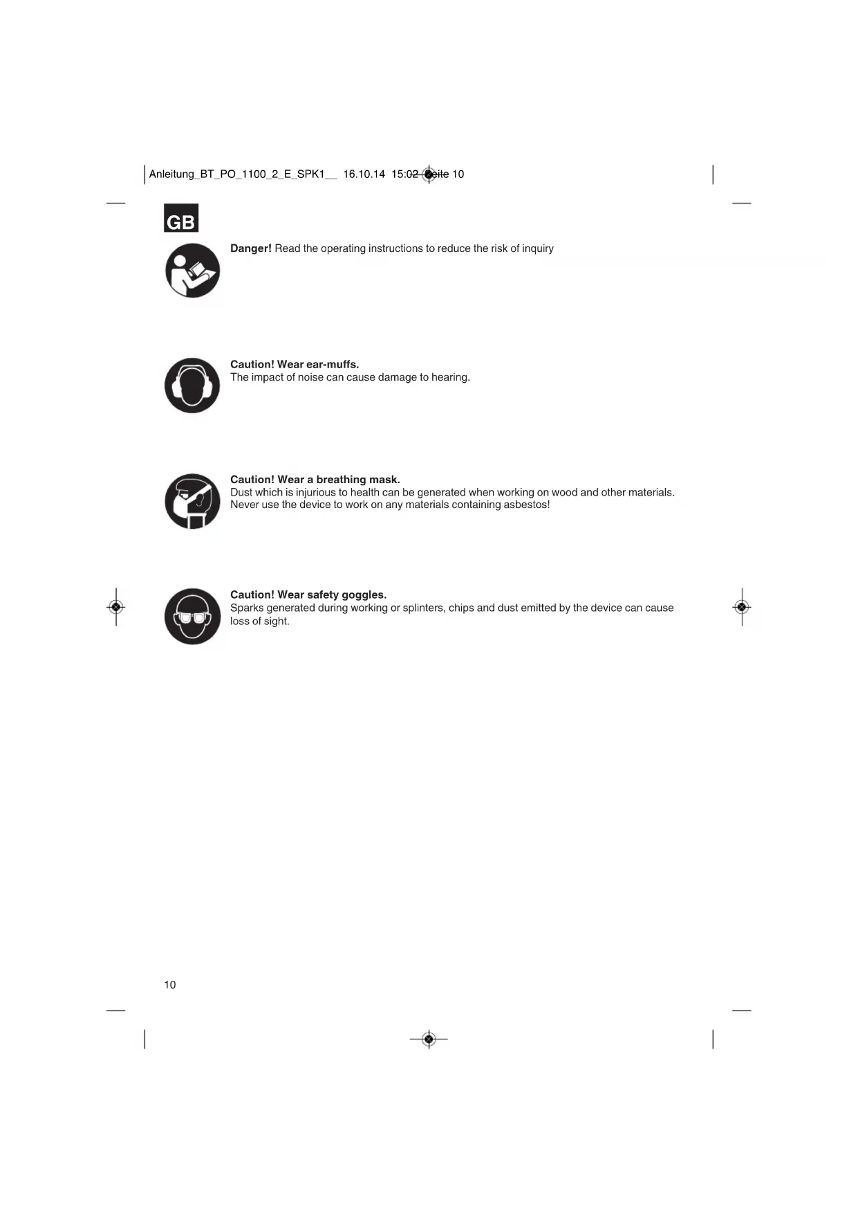Danger! Read the operating instructions to reduce the risk of inquiry Caution! Wear ear-muffs. The impact of noise can cause damage to hearing. Caution! Wear a breathing mask. Dust which is injurious to health can be generated when working on wood and other materials. Never use the device to work on any materials containing asbestos! Caution! Wear safety goggles. Sparks generated during working or splinters, chips and dust emitted by the device can cause loss of sight. Anleitung_BT_PO_1100_2_E_SPK1__ 16.10.14 15:02 Seite 10Danger! When using equipment, a few safety precautions must be observed to avoid injuries and damage. Please read the complete operating manual with due care. Keep this manual in a safe place, so that the information is available at all times. If you give the equipment to any other person, give them these operating instructions as well. We accept no liability for damage or accidents which arise due to non-observance of these instructions and the safety information.
