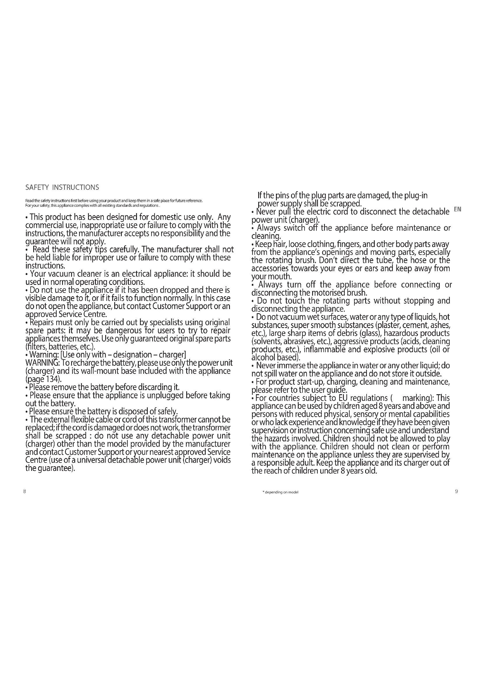 The charger becomes hot This is perfectly normal. The vacuum cleaner can remain permanently connected to the charger without any risk.The charger is connected but your appliance is not charging The charger is not properly connected to the appliance or is faulty. Check that the charger is properly connected or contact an Approved Service Centre to change the charger.Your appliance stops during operation and the charge light(s) ash(es) very quickly Your appliance may be overheating. Stop the appliance and leave it to cool down for at least 1hour.The charge light ashes and the appliance stops The appliance has lost its charge. Recharge the vacuum cleaner.The power-brush is not working properly or makes a noise The rotating brush or hose is obstructed.Stop the vacuum cleaner and clean them.The brush is worn.Contact an Approved Service Centre to change the brush.The belt is worn.Contact an Approved Service Centre to change the belt.The power-brush stops during use of the vacuum cleaner The heat safety device has come on.Stop the vacuum cleaner. Check that nothing is obstructing the rotation of the brush; if there is an obstruction, remove it and clean the power-brush, then turn on the vacuum cleaner.Your vacuum cleaner suction is not working properly or is making a whistling noise The tube or hose is partially blocked. Unblock them.The dust collector is full. Empty it and clean it.The dust collector is not properly tted. Re-position it correctly. The suction head is dirty. Remove the power-brush and clean it.The motor protection lter is full. Clean it.When the vacuum cleaner is charged, the charge light(s) ash(es) red or very quickly.The correct charger is not being used or the charger is faulty.Contact an Approved Service Centre to change the charger.The red LED on the product ashes during useThe suction head brush is blocked.Stop vacuuming and check that there is nothing blocking the rotation of the brush.The battery temperature is too high.Leave the product to rest for 30minutes. If the problem persists, replace the battery.The tube and/or suction head connectors are dirty or damaged.Clean the tube and suction head connectors with a cloth.The suction motor is not working.Contact an Approved Service Centre to have your appliance repaired. Please keep this user manual. ENVIRONMENT In accordance with existing regulation, any end-of-life appliances must be taken to an approved Service Centre which will take responsibility for managing their disposal. Let’s help protect the environment. Your device is designed to work for many years. But when you decide to replace it, don’t forget to think about how you can help protect the environment by allowing it to be reused, recycled or recovered in some other way. Waste electrical and electronic equipment may contain harmful substances that can cause harm to the environment and human health. This label indicates that this product must not be disposed of with household waste. Take it to a collection point, to the distributor when buying a new equivalent product, or an approved service center for processing. Before disposing of the device, remove the battery and dispose of it in accordance with local laws and local arrangements. If you have any questions, please contact your product dealer who can tell you what to do.DE