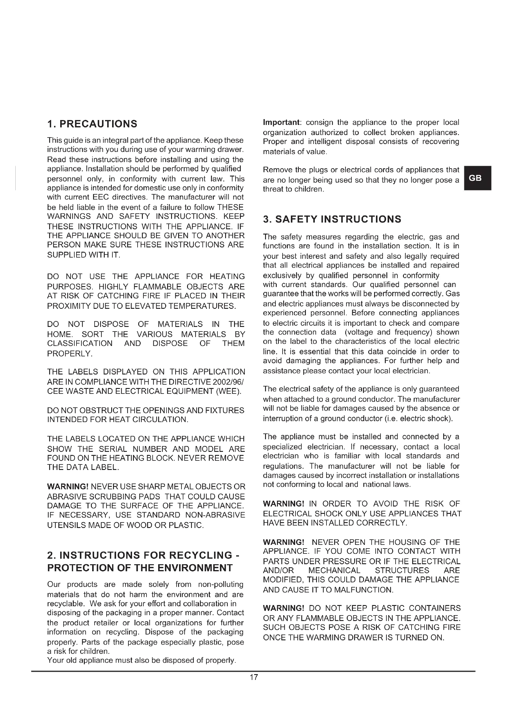 This guide is an integral part of the appliance. Keep these instructions with you during use of your warming drawer. Read these instructions before installing and using the appliance. Installation should be performed by qualied personnel only, in conformity with current law. This appliance is intended for domestic use only in conformity with current EEC directives. The manufacturer will not be held liable in the event of a failure to follow THESE