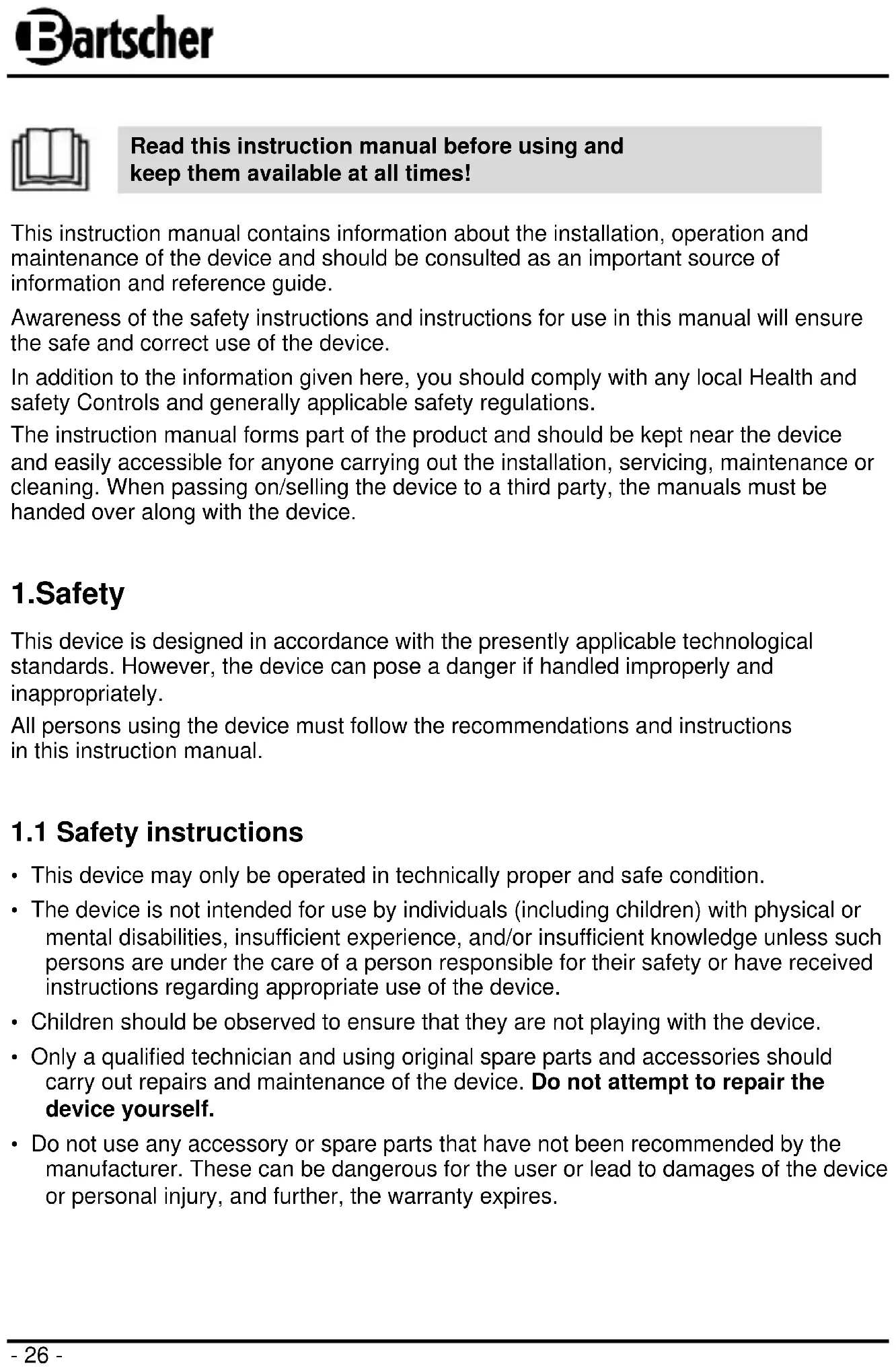 Read this instruction manual before using and keep them available at all times! This instruction manual contains information about the installation, operation and maintenance of the device and should be consulted as an important source of information and reference guide. Awareness of the safety instructions and instructions for use in this manual will ensure the safe and correct use of the device. In addition to the information given here, you should comply with any local Health and safety Controls and generally applicable safety regulations. The instruction manual forms part of the product and should be kept near the device and easily accessible for anyone carrying out the installation, servicing, maintenance or cleaning. When passing on/selling the device to a third party, the manuals must be handed over along with the device.