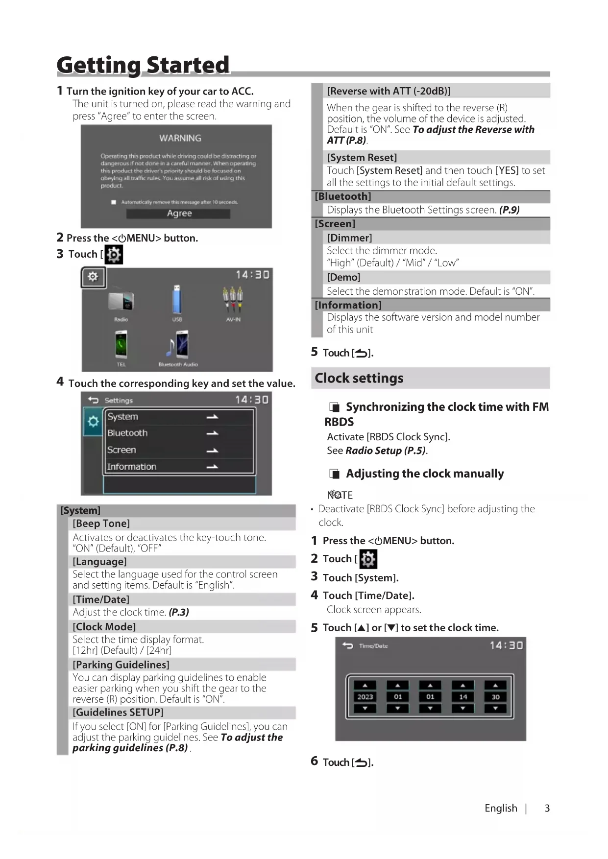 English | Getting Started 1 Turn the ignition key of your car to ACC. The unit is turned on, please read the warning and press “Agree” to enter the screen. 2 Press the <8MENU> button.