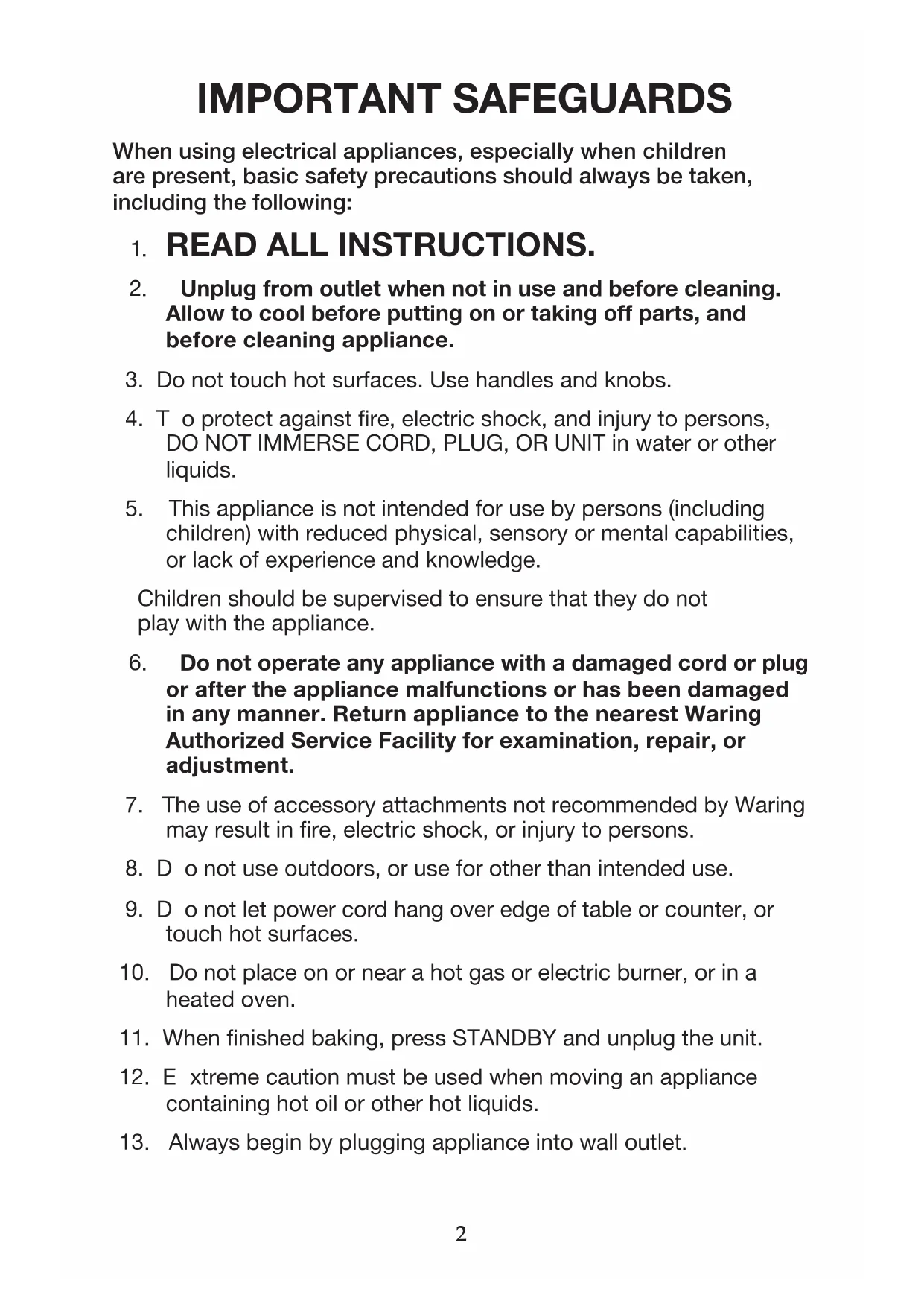 or after the appliance malfunctions or has been damaged in any manner. Return appliance to the nearest Waring Authorized Service Facility for examination, repair, or adjustment.