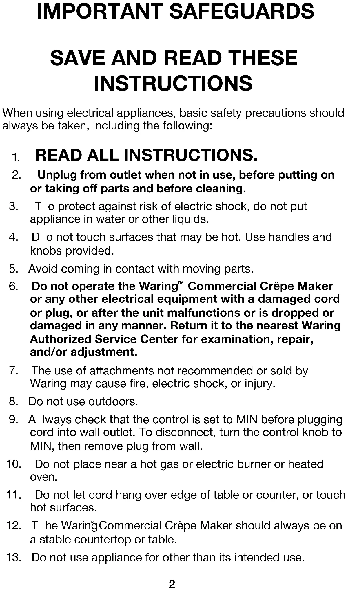 Commercial Crêpe Maker or any other electrical equipment with a damaged cord or plug, or after the unit malfunctions or is dropped or damaged in any manner. Return it to the nearest Waring Authorized Service Center for examination, repair, and/or adjustment.