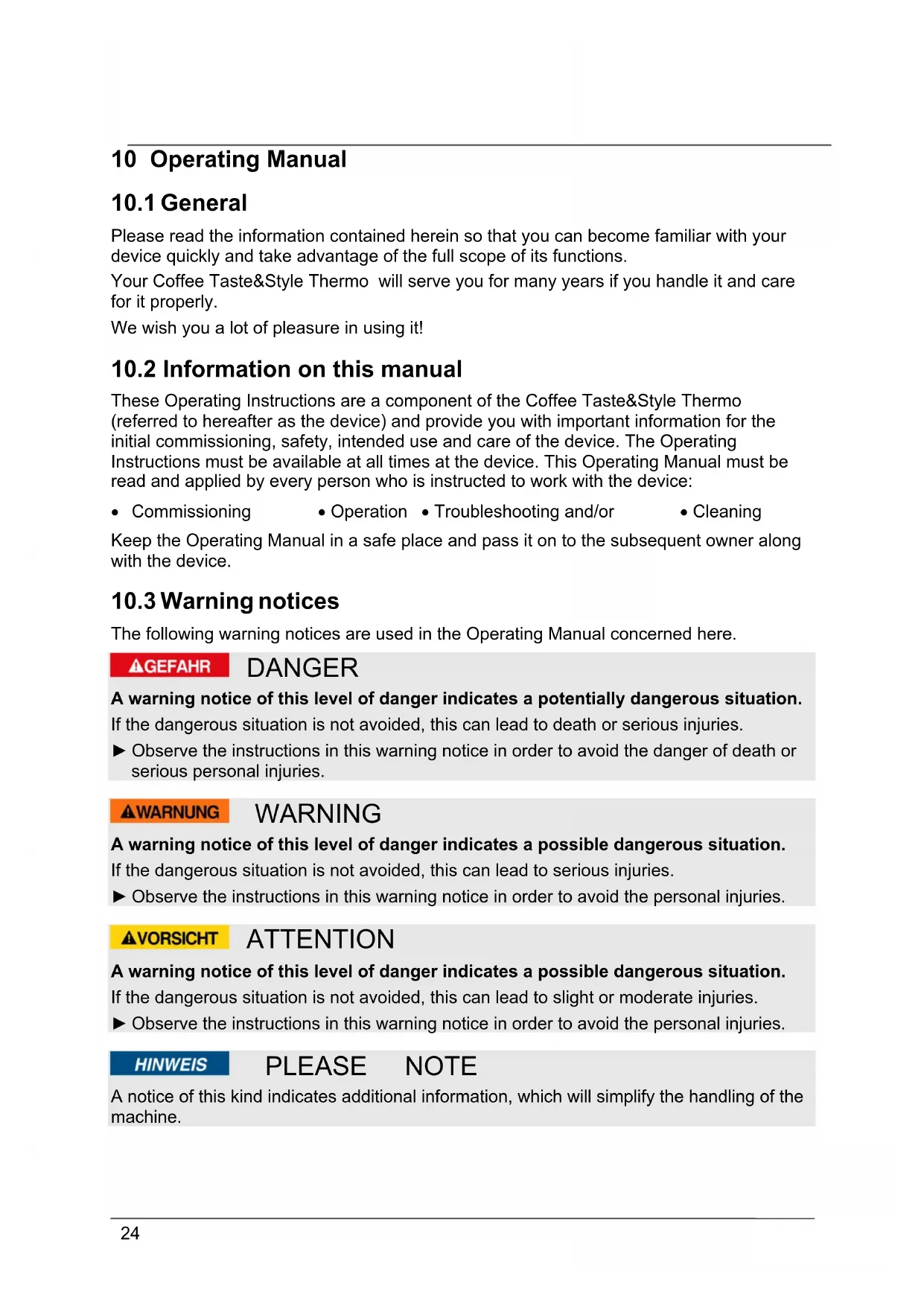 These Operating Instructions are a component of the Coffee Taste&Style Thermo (referred to hereafter as the device) and provide you with important information for the initial commissioning, safety, intended use and care of the device. The Operating Instructions must be available at all times at the device. This Operating Manual must be read and applied by every person who is instructed to work with the device: Commissioning Operation Troubleshooting and/or Cleaning Keep the Operating Manual in a safe place and pass it on to the subsequent owner along with the device.