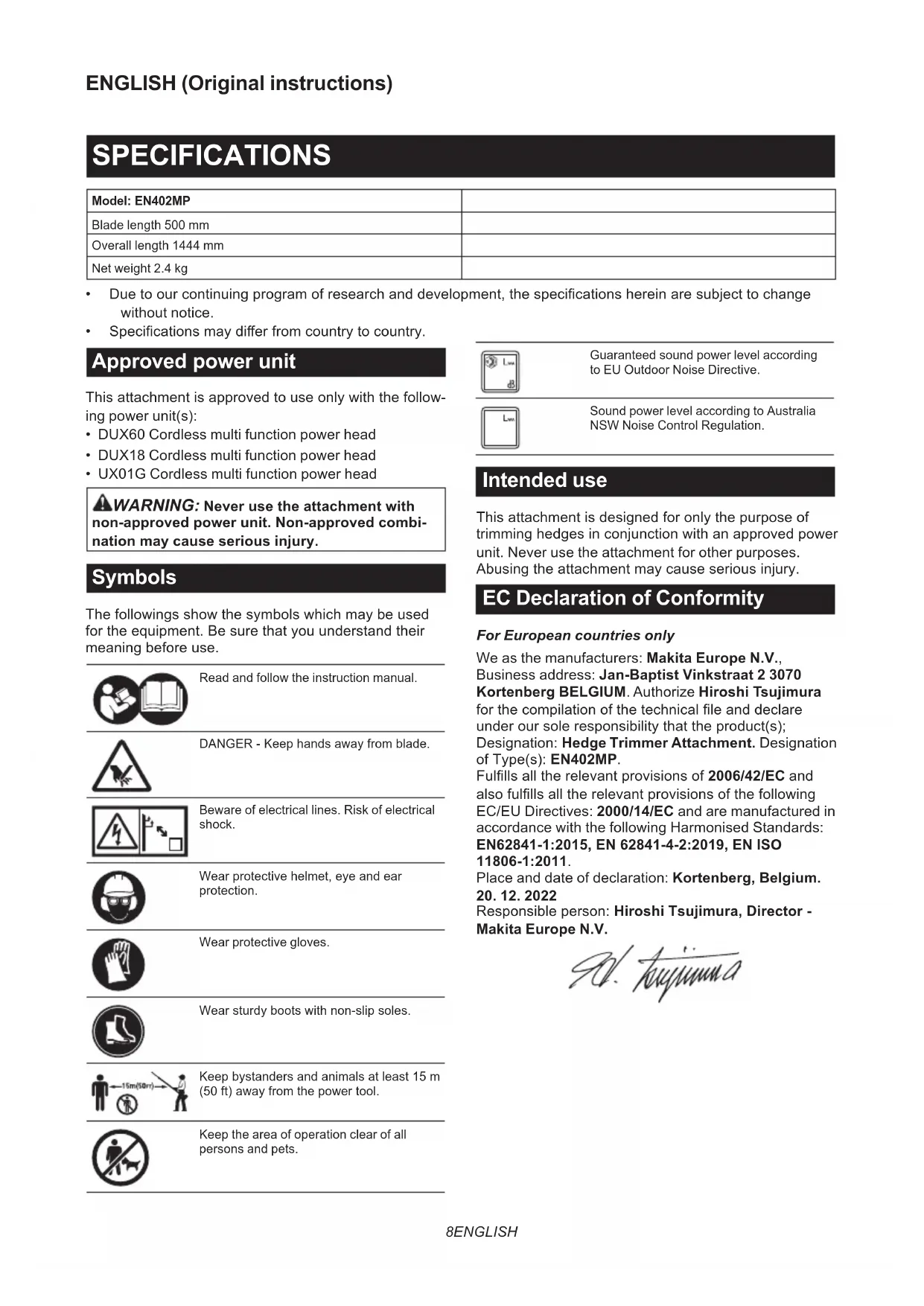 non-approved power unit. Non-approved combi- nation may cause serious injury. Symbols Thefollowingsshowthesymbolswhichmaybeused fortheequipment.Besurethatyouunderstandtheir meaningbeforeuse. Read and follow the instruction manual. DANGER-Keephandsawayfromblade. Beware of electrical lines. Risk of electrical shock. Wearprotectivehelmet,eyeandear protection. Wear protective gloves. Wearsturdybootswithnon-slipsoles. Keepbystandersandanimalsatleast15m (50ft)awayfromthepowertool. Keep the area of operation clear of all persons and pets. Guaranteed sound power level according to EU Outdoor Noise Directive. Sound power level according to Australia NSW Noise Control Regulation. Intended use Thisattachmentisdesignedforonlythepurposeof trimminghedgesinconjunctionwithanapprovedpower unit. Never use the attachment for other purposes. Abusingtheattachmentmaycauseseriousinjury. EC Declaration of Conformity For European countries only We as the manufacturers: Makita Europe N.V., Business address: Jan-Baptist Vinkstraat 2 3070 Kortenberg BELGIUM. Authorize Hiroshi Tsujimura forthecompilationofthetechnicalleanddeclare underoursoleresponsibilitythattheproduct(s); Designation: Hedge Trimmer Attachment. Designation ofType(s):EN402MP. Fulllsalltherelevantprovisionsof2006/42/EC and alsofulllsalltherelevantprovisionsofthefollowing EC/EU Directives: 2000/14/EC and are manufactured in accordance with the following Harmonised Standards: EN62841-1:2015, EN 62841-4-2:2019, EN ISO 11806-1:2011. Place and date of declaration: Kortenberg, Belgium.