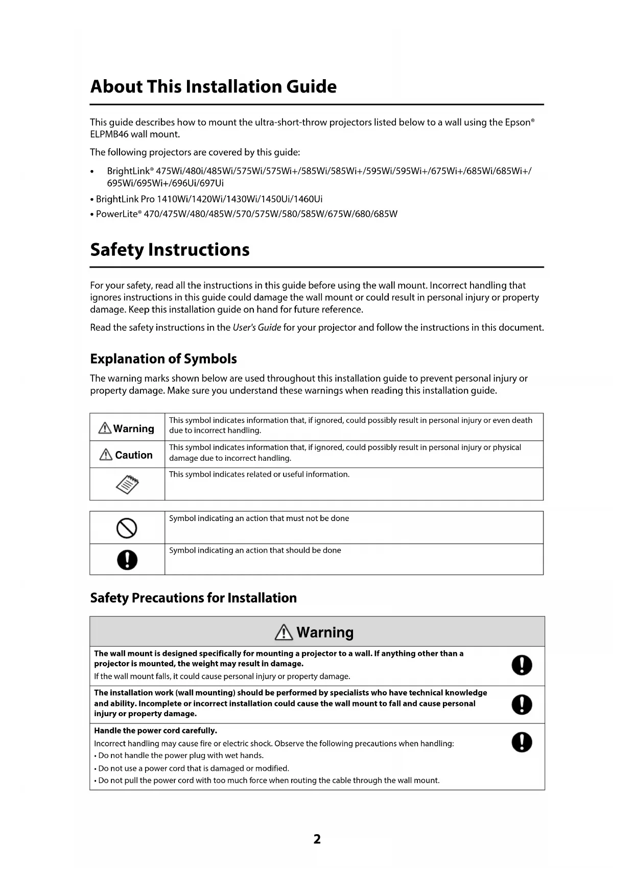 - PowerLite® 470/475W/480/485W/570/575W/580/585W/675W/680/685W Safety Instructions For your safety, read all the instructions in this guide before using the wall mount. Incorrect handling that ignores instructions in this guide could damage the wall mount or could result in personal injury or property damage. Keep this installation guide on hand for future reference. Read the safety instructions in the User's Guide for your projector and follow the instructions in this document. Explanation of Symbols The warning marks shown below are used throughout this installation guide to prevent personal injury or property damage. Make sure you understand these warnings when reading this installation guide. Safety Precautions for Installation This symbol indicates information that, if ignored, could possibly result in personal injury or even death due to incorrect handling. This symbol indicates information that, if ignored, could possibly result in personal injury or physical damage due to incorrect handling.This symbol indicates related or useful information. Symbol indicating an action that must not be doneSymbol indicating an action that should be doneThe wall mount is designed specifically for mounting a projector to a wall. If anything other than a projector is mounted, the weight may result in damage.If the wall mount falls, it could cause personal injury or property damage. The installation work (wall mounting) should be performed by specialists who have technical knowledge and ability. Incomplete or incorrect installation could cause the wall mount to fall and cause personal injury or property damage.Handle the power cord carefully. Incorrect handling may cause fire or electric shock. Observe the following precautions when handling: