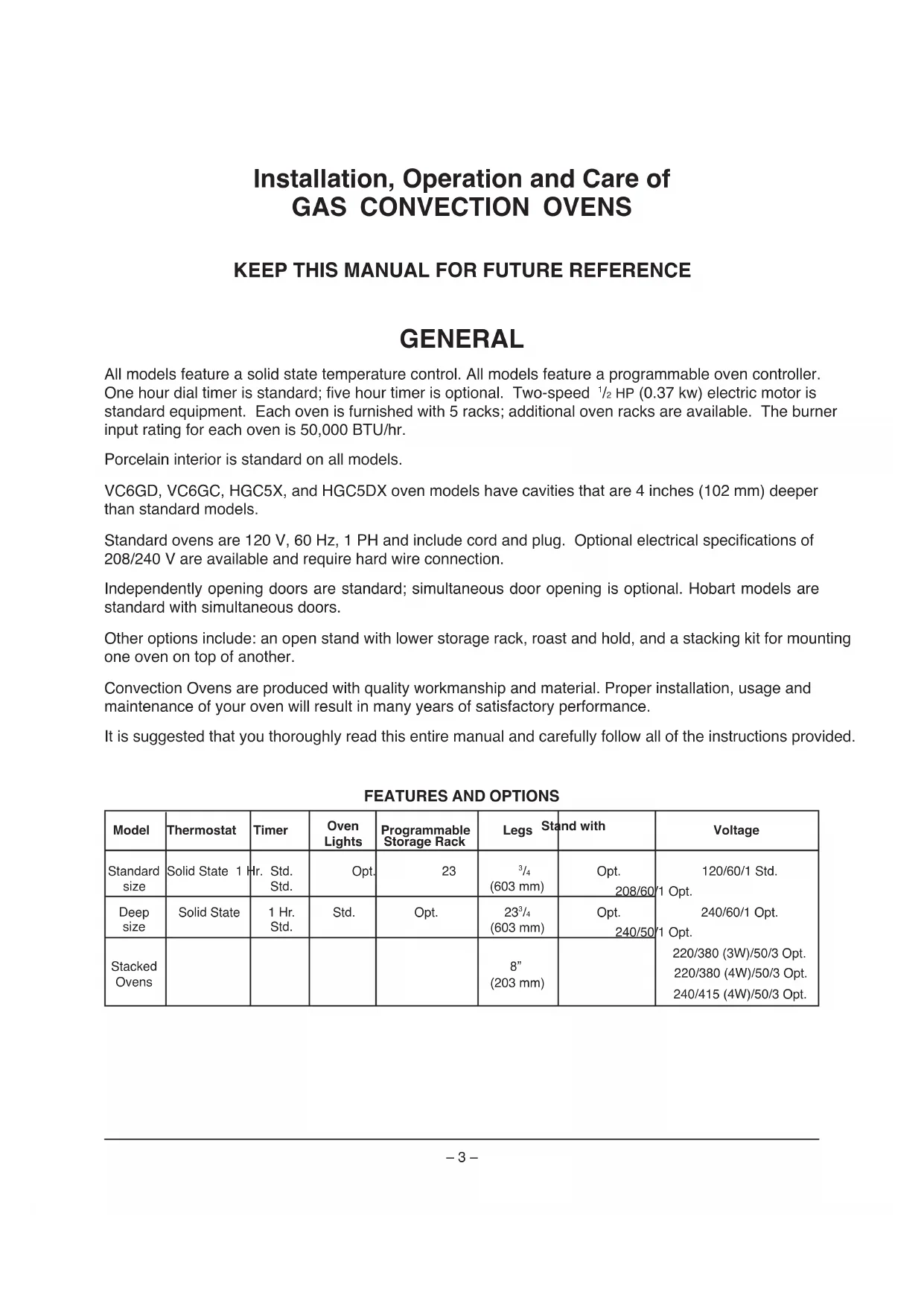 /2 HP (0.37 kw) electric motor is standard equipment. Each oven is furnished with 5 racks; additional oven racks are available. The burner input rating for each oven is 50,000 BTU/hr. Porcelain interior is standard on all models. VC6GD, VC6GC, HGC5X, and HGC5DX oven models have cavities that are 4 inches (102 mm) deeper than standard models. Standard ovens are 120 V, 60 Hz, 1 PH and include cord and plug. Optional electrical specications of 208/240 V are available and require hard wire connection. Independently opening doors are standard; simultaneous door opening is optional. Hobart models are standard with simultaneous doors. Other options include: an open stand with lower storage rack, roast and hold, and a stacking kit for mounting one oven on top of another. Convection Ovens are produced with quality workmanship and material. Proper installation, usage and maintenance of your oven will result in many years of satisfactory performance. It is suggested that you thoroughly read this entire manual and carefully follow all of the instructions provided. Model Thermostat Timer Oven Programmable Legs Stand with Voltage Lights Storage Rack Standard Solid State 1 Hr. Std. Opt. 23 /4 Opt. 120/60/1 Std. size Std. (603 mm) 208/60/1 Opt. Deep Solid State 1 Hr. Std. Opt. 23
