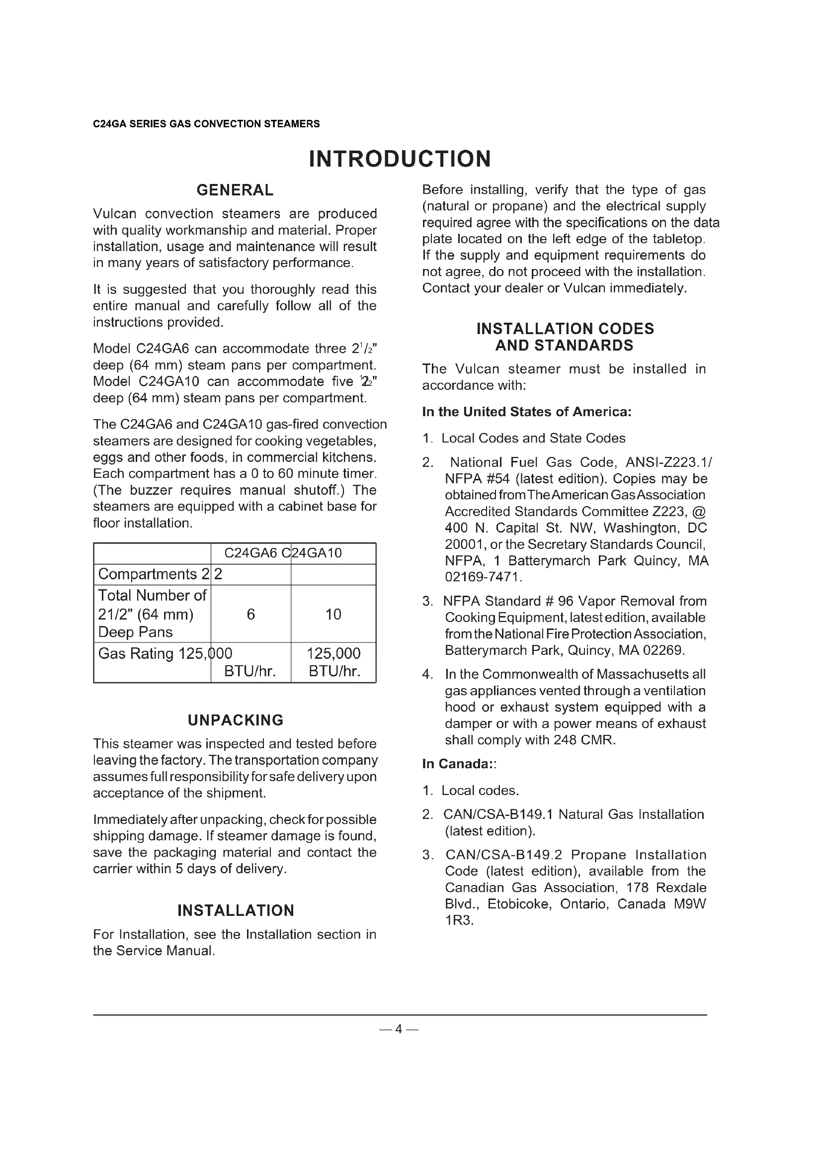 INTRODUCTION GENERAL Vulcan convection steamers are produced with quality workmanship and material. Proper installation, usage and maintenance will result in many years of satisfactory performance. It is suggested that you thoroughly read this entire manual and carefully follow all of the instructions provided. Model C24GA6 can accommodate three 2