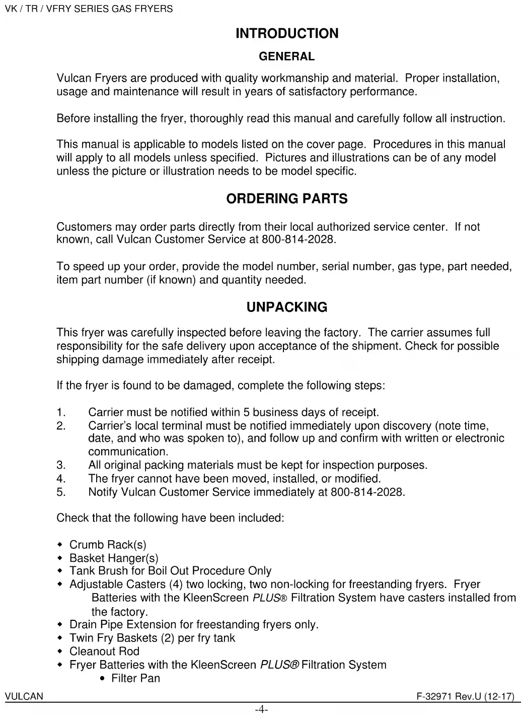 INTRODUCTION GENERAL Vulcan Fryers are produced with quality workmanship and material. Proper installation, usage and maintenance will result in years of satisfactory performance. Before installing the fryer, thoroughly read this manual and carefully follow all instruction. This manual is applicable to models listed on the cover page. Procedures in this manual will apply to all models unless specified. Pictures and illustrations can be of any model unless the picture or illustration needs to be model specific. ORDERING PARTS Customers may order parts directly from their local authorized service center. If not known, call Vulcan Customer Service at 800-814-2028. To speed up your order, provide the model number, serial number, gas type, part needed, item part number (if known) and quantity needed. UNPACKING This fryer was carefully inspected before leaving the factory. The carrier assumes full responsibility for the safe delivery upon acceptance of the shipment. Check for possible shipping damage immediately after receipt. If the fryer is found to be damaged, complete the following steps: