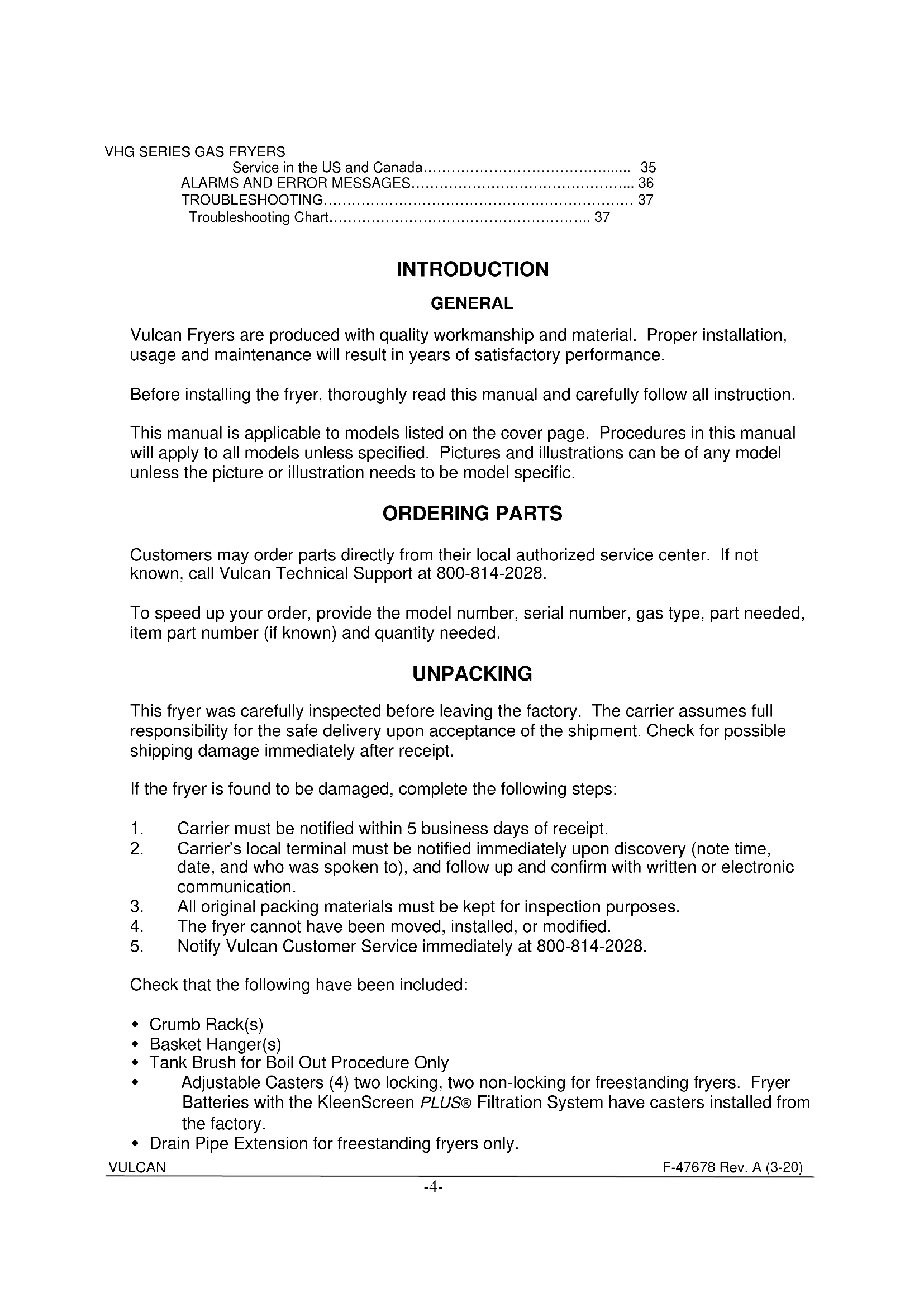 INTRODUCTION GENERAL Vulcan Fryers are produced with quality workmanship and material. Proper installation, usage and maintenance will result in years of satisfactory performance. Before installing the fryer, thoroughly read this manual and carefully follow all instruction. This manual is applicable to models listed on the cover page. Procedures in this manual will apply to all models unless specified. Pictures and illustrations can be of any model unless the picture or illustration needs to be model specific. ORDERING PARTS Customers may order parts directly from their local authorized service center. If not known, call Vulcan Technical Support at 800-814-2028. To speed up your order, provide the model number, serial number, gas type, part needed, item part number (if known) and quantity needed. UNPACKING This fryer was carefully inspected before leaving the factory. The carrier assumes full responsibility for the safe delivery upon acceptance of the shipment. Check for possible shipping damage immediately after receipt. If the fryer is found to be damaged, complete the following steps: