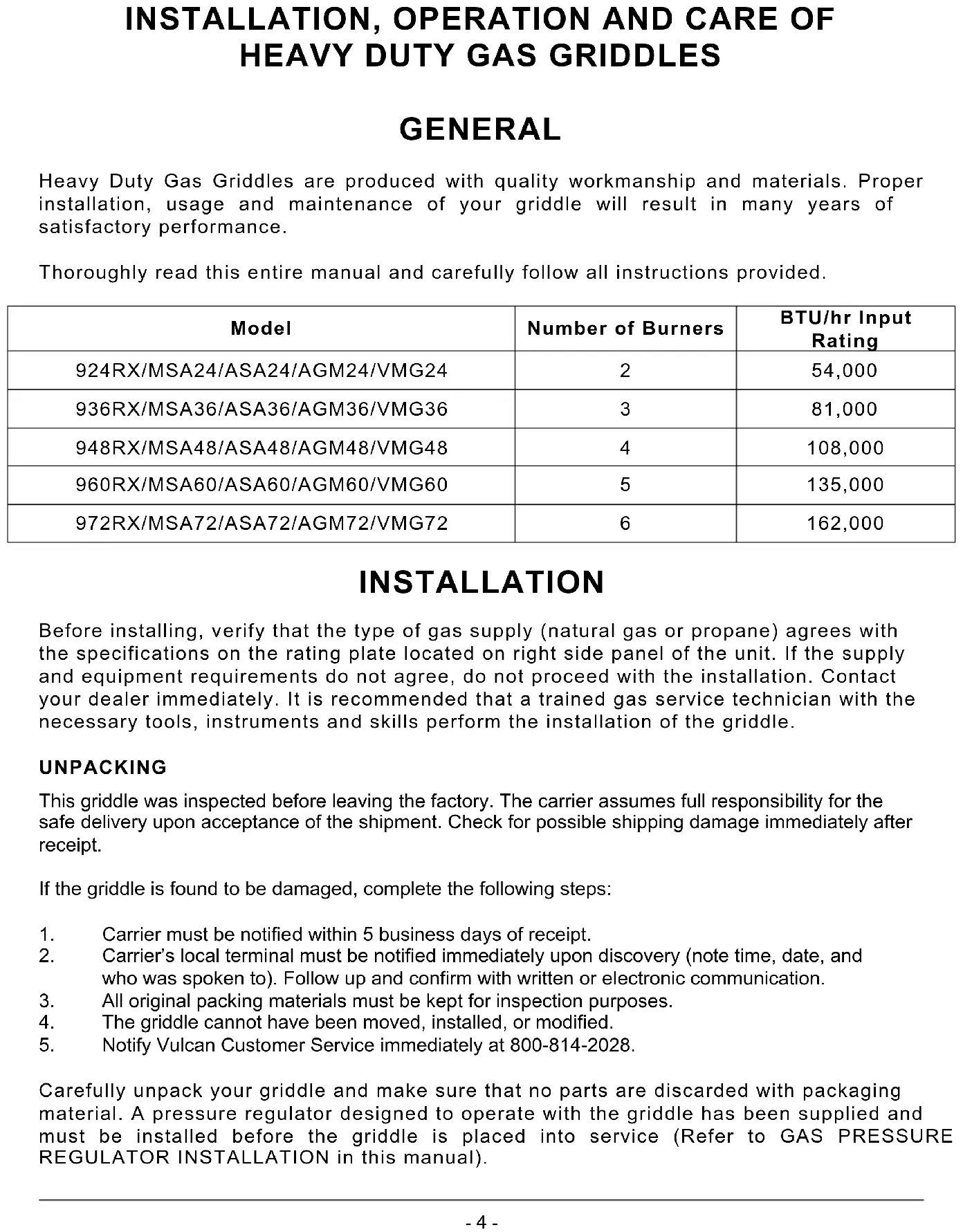 INSTALLATION Before installing, verify that the type of gas supply (natural gas or propane) agrees with the specifications on the rating plate located on right side panel of the unit. If the supply and equipment requirements do not agree, do not proceed with the installation. Contact your dealer immediately. It is recommended that a trained gas service technician with the necessary tools, instruments and skills perform the installation of the griddle. UNPACKING This griddle was inspected before leaving the factory. The carrier assumes full responsibility for the safe delivery upon acceptance of the shipment. Check for possible shipping damage immediately after receipt. If the griddle is found to be damaged, complete the following steps: