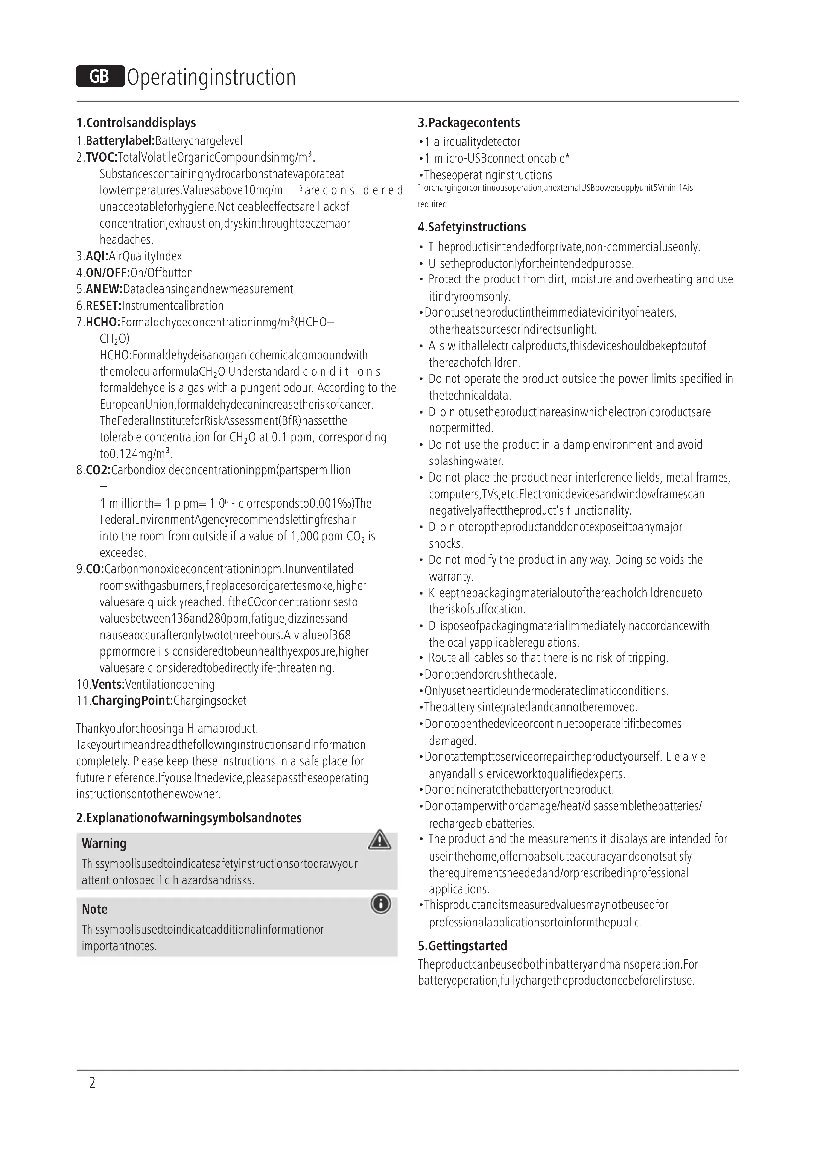 TVOC mg/m³ 0-0.5 0.5 -0.6 0.6 -1.5 1.5 -3.0 3.0 -6.0 6.0 -12.0 CO2 ppm 0-450 451 -1000 1001 -1500 1501 -2000 2001 -3000 3001 -5000 CO ppm 0-5051-100 101 -200 201 -400 401 -800 801 -2400 AQI 01 02 03 04 05 06 Good Moderate Unhealthy for sensitive people Unhealthy Very unhealthy Endangering health Specically by providing the value for the CO2 concentration in the air (8) ,conclusions can be drawn about aerosols with viruses (e.g. Covid 19) present in the air.Although these arenot directly detectable, increased CO2 pollution is at the same time ameasureofvirus- contaminated air.This can be remedied by regular airing. Permanently inhaling bad and stale air can cause tiredness, headaches, eye irritation, etc. The ability to perform and concentrate decreases noticeably as aresult.4 The display of the concentrations of carbon monoxide (9), formaldehyde (7) and other volatile compounds (2) also helps to ensurethat remedial action can be taken in good time by means of ventilation. Furthermore, the different displays can help to identify the corresponding sources: e.g. formaldehyde emissions from furniture, wood panelling, etc. Respiratory diseases can thus be prevented and ahealthy indoor climate created.