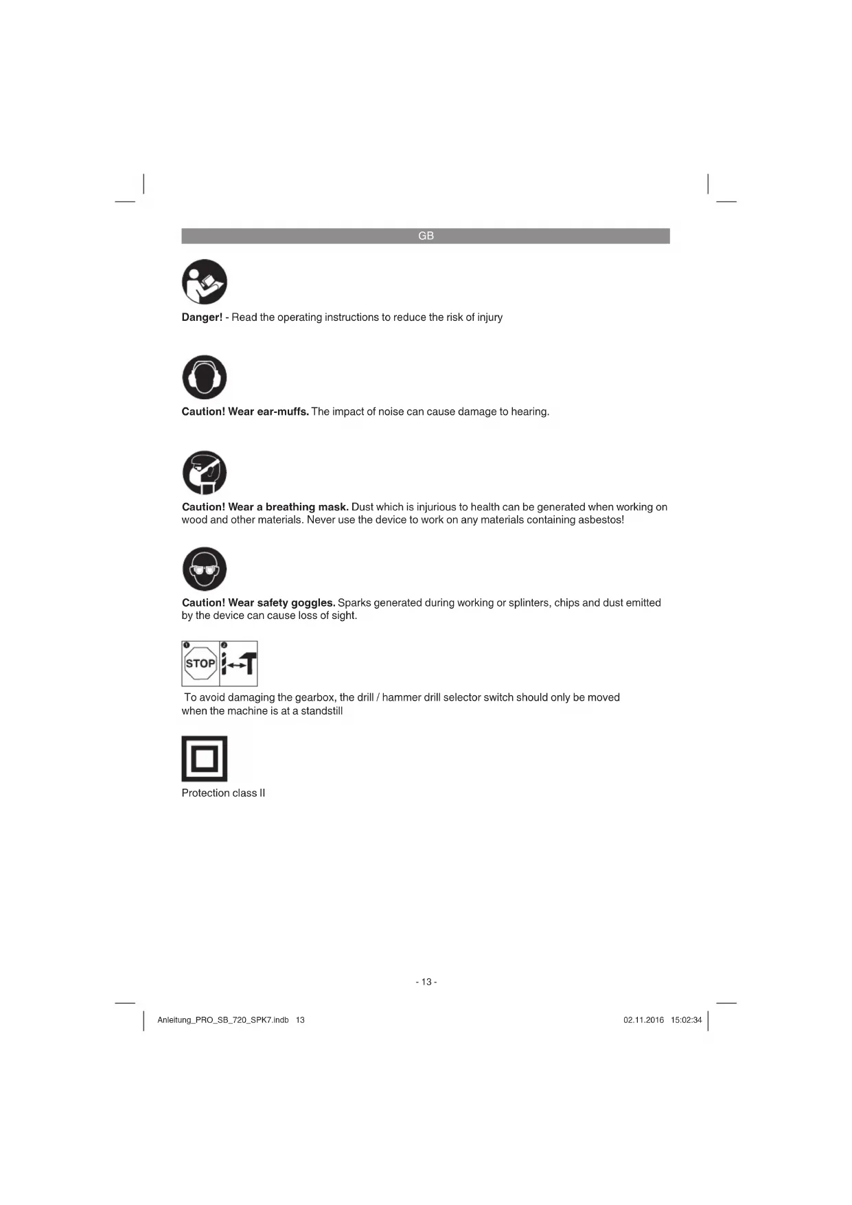 Danger! - Read the operating instructions to reduce the risk of injury Caution! Wear ear-muff s. The impact of noise can cause damage to hearing. Caution! Wear safety goggles. Sparks generated during working or splinters, chips and dust emitted by the device can cause loss of sight. Caution! Wear a breathing mask. Dust which is injurious to health can be generated when working on wood and other materials. Never use the device to work on any materials containing asbestos! To avoid damaging the gearbox, the drill / hammer drill selector switch should only be moved when the machine is at a standstill Protection class II Anleitung_PRO_SB_720_SPK7.indb 13Anleitung_PRO_SB_720_SPK7.indb 13 02.11.2016 15:02:3402.11.2016 15:02:34GB