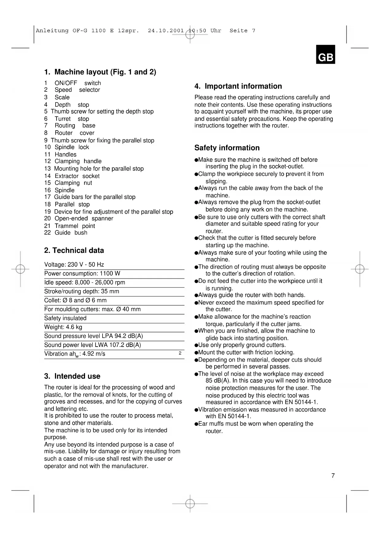 Please read the operating instructions carefully and note their contents. Use these operating instructions to acquaint yourself with the machine, its proper use and essential safety precautions. Keep the operating instructions together with the router. Safety information Make sure the machine is switched off before inserting the plug in the socket-outlet. Clamp the workpiece securely to prevent it from slipping. Always run the cable away from the back of the machine. Always remove the plug from the socket-outlet before doing any work on the machine. Be sure to use only cutters with the correct shaft diameter and suitable speed rating for your router. Check that the cutter is fitted securely before starting up the machine. Always make sure of your footing while using the machine. The direction of routing must always be opposite to the cutter’s direction of rotation. Do not feed the cutter into the workpiece until it is running. Always guide the router with both hands. Never exceed the maximum speed specified for the cutter. Make allowance for the machine’s reaction torque, particularly if the cutter jams. When you are finished, allow the machine to glide back into starting position. Use only properly ground cutters. Mount the cutter with friction locking. Depending on the material, deeper cuts should be performed in several passes. The level of noise at the workplace may exceed 85 dB(A). In this case you will need to introduce noise protection measures for the user. The noise produced by this electric tool was measured in accordance with EN 50144-1. Vibration emission was measured in accordance with EN 50144-1. Ear muffs must be worn when operating the router.
