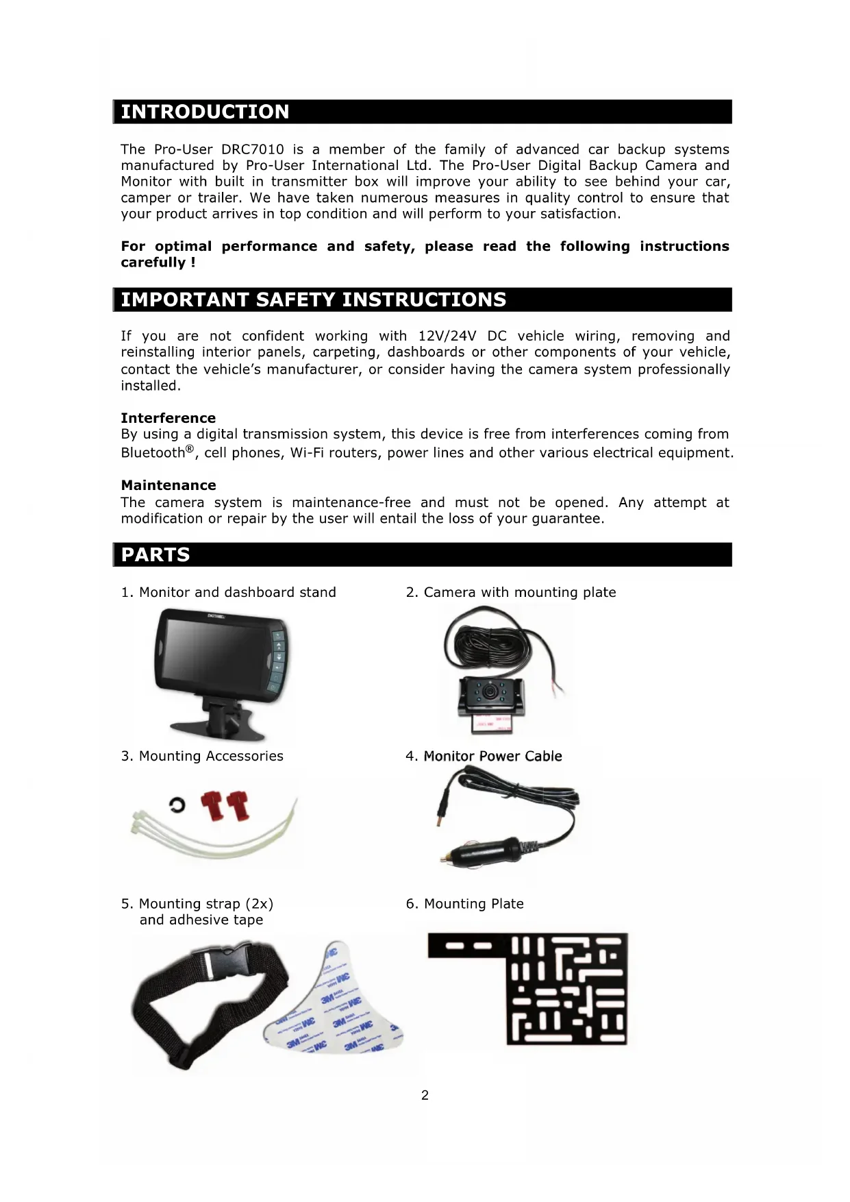 If you are not confident working with 12V/24V DC vehicle wiring, removing and reinstalling interior panels, carpeting, dashboards or other components of your vehicle, contact the vehicle’s manufacturer, or consider having the camera system professionally installed. Interference By using a digital transmission system, this device is free from interferences coming from Bluetooth