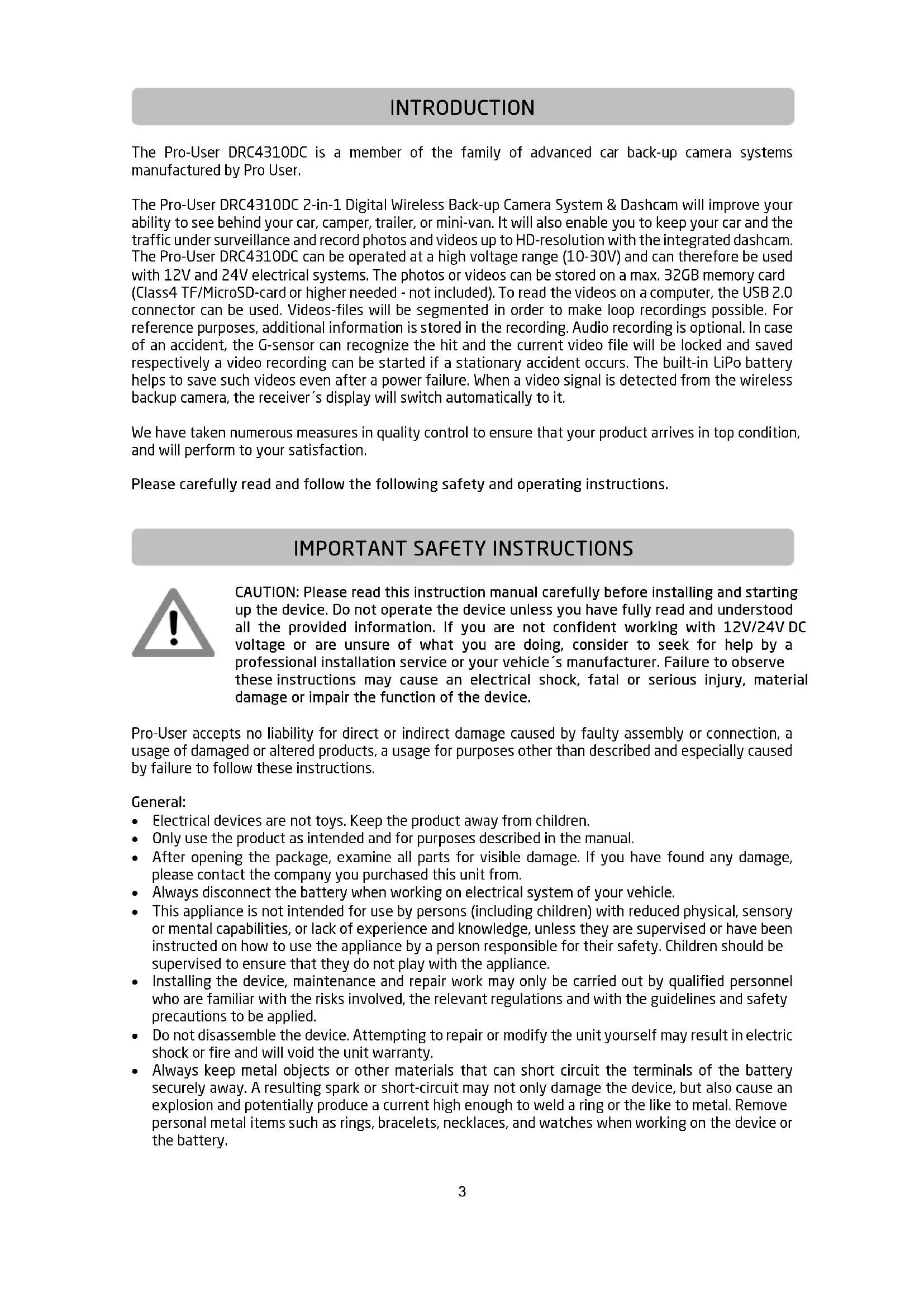 CAUTION: Please read this instruction manual carefully before installing and starting up the device. Do not operate the device unless you have fully read and understood all the provided information. If you are not confident working with 12V/24V DC voltage or are unsure of what you are doing, consider to seek for help by a professional installation service or your vehicle´s manufacturer. Failure to observe these instructions may cause an electrical shock, fatal or serious injury, material damage or impair the function of the device. Pro-User accepts no liability for direct or indirect damage caused by faulty assembly or connection, a usage of damaged or altered products, a usage for purposes other than described and especially caused by failure to follow these instructions. General: