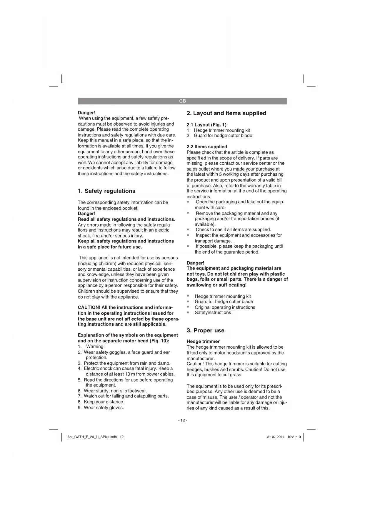 Hedge trimmer The hedge trimmer mounting kit is allowed to be fi tted only to motor heads/units approved by the manufacturer. Caution! This hedge trimmer is suitable for cutting hedges, bushes and shrubs. Caution! Do not use this equipment to cut grass. The equipment is to be used only for its prescri- bed purpose. Any other use is deemed to be a case of misuse. The user / operator and not the manufacturer will be liable for any damage or inju- ries of any kind caused as a result of this. Anl_GATH_E_20_Li_SPK7.indb 12Anl_GATH_E_20_Li_SPK7.indb 12 31.07.2017 10:21:1031.07.2017 10:21:10GB