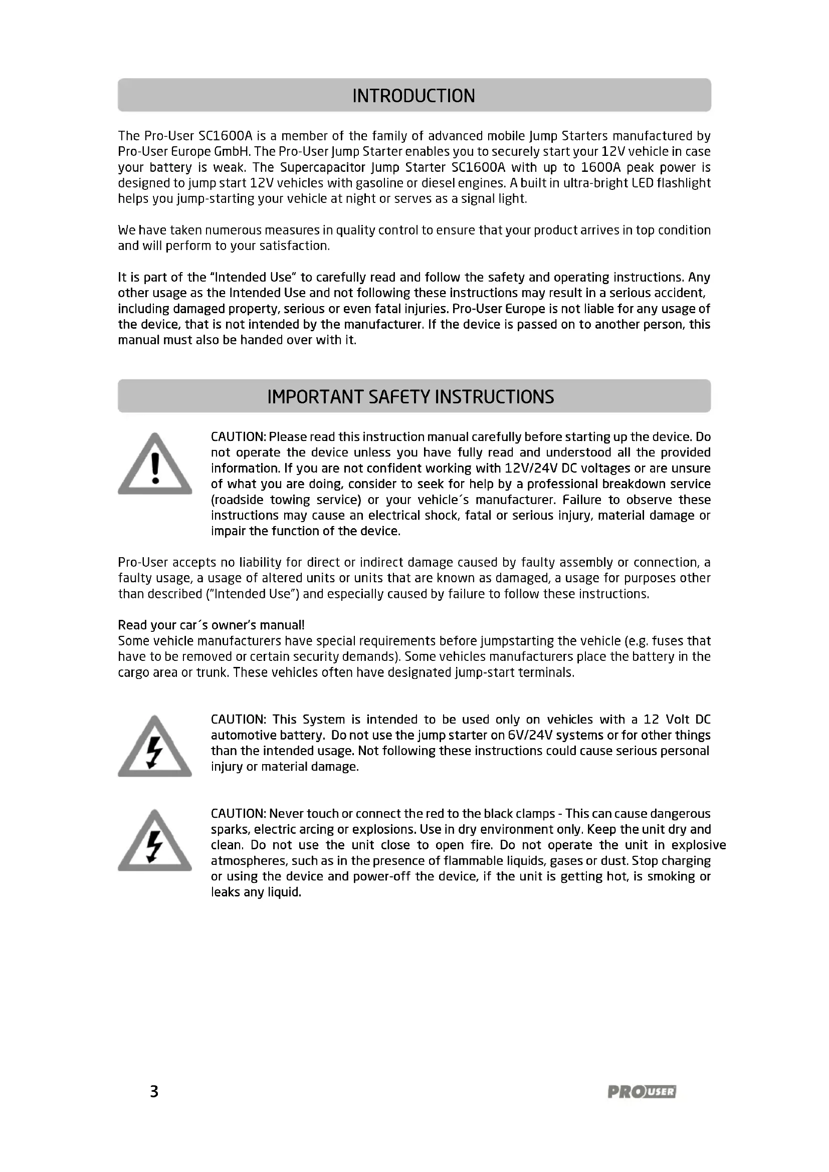 The Pro-User SC1600A is a member of the family of advanced mobile Jump Starters manufactured by Pro-User Europe GmbH. The Pro-User Jump Starter enables you to securely start your 12V vehicle in case your battery is weak. The Supercapacitor Jump Starter SC1600A with up to 1600A peak power is designed to jump start 12V vehicles with gasoline or diesel engines. A built in ultra-bright LED flashlight helps you jump-starting your vehicle at night or serves as a signal light. We have taken numerous measures in quality control to ensure that your product arrives in top condition and will perform to your satisfaction. It is part of the “Intended Use” to carefully read and follow the safety and operating instructions. Any other usage as the Intended Use and not following these instructions may result in a serious accident, including damaged property, serious or even fatal injuries. Pro-User Europe is not liable for any usage of the device, that is not intended by the manufacturer. If the device is passed on to another person, this manual must also be handed over with it.