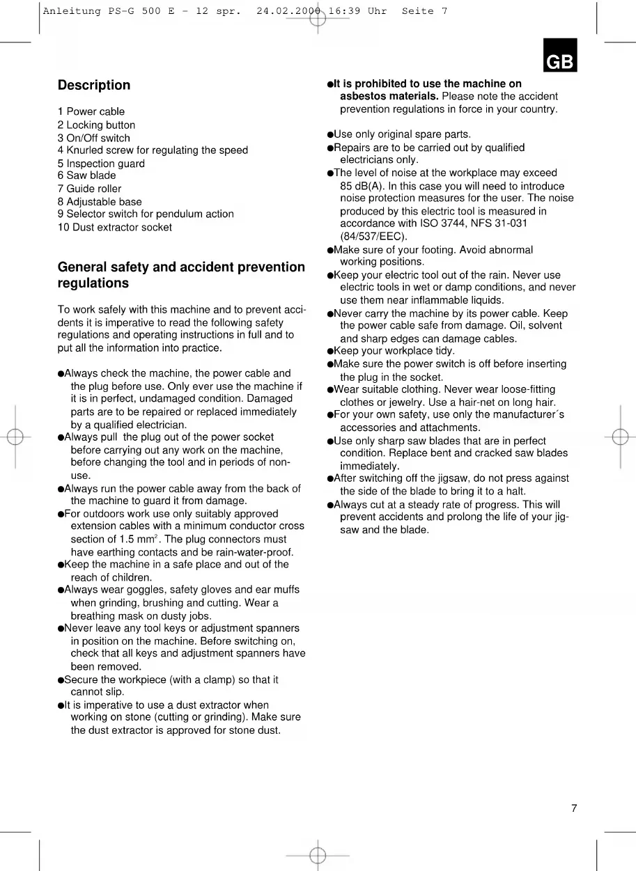 Einstellung Pendelhub Pos. 0 keine Pendelung Pos. 1 leichte Pendelung Pos. 2 mittlere Pendelung Anleitung PS-G 500 E - 12 spr. 24.02.2000 16:39 Uhr Seite 67 Description 1 Power cable 2 Locking button 3 On/Off switch 4 Knurled screw for regulating the speed 5 Inspection guard 6 Saw blade 7 Guide roller 8 Adjustable base 9 Selector switch for pendulum action 10 Dust extractor socket General safety and accident prevention regulations To work safely with this machine and to prevent acci- dents it is imperative to read the following safety regulations and operating instructions in full and to put all the information into practice. Always check the machine, the power cable and the plug before use. Only ever use the machine if it is in perfect, undamaged condition. Damaged parts are to be repaired or replaced immediately by a qualified electrician. Always pull the plug out of the power socket before carrying out any work on the machine, before changing the tool and in periods of non- use. Always run the power cable away from the back of the machine to guard it from damage. For outdoors work use only suitably approved extension cables with a minimum conductor cross section of 1.5 mm