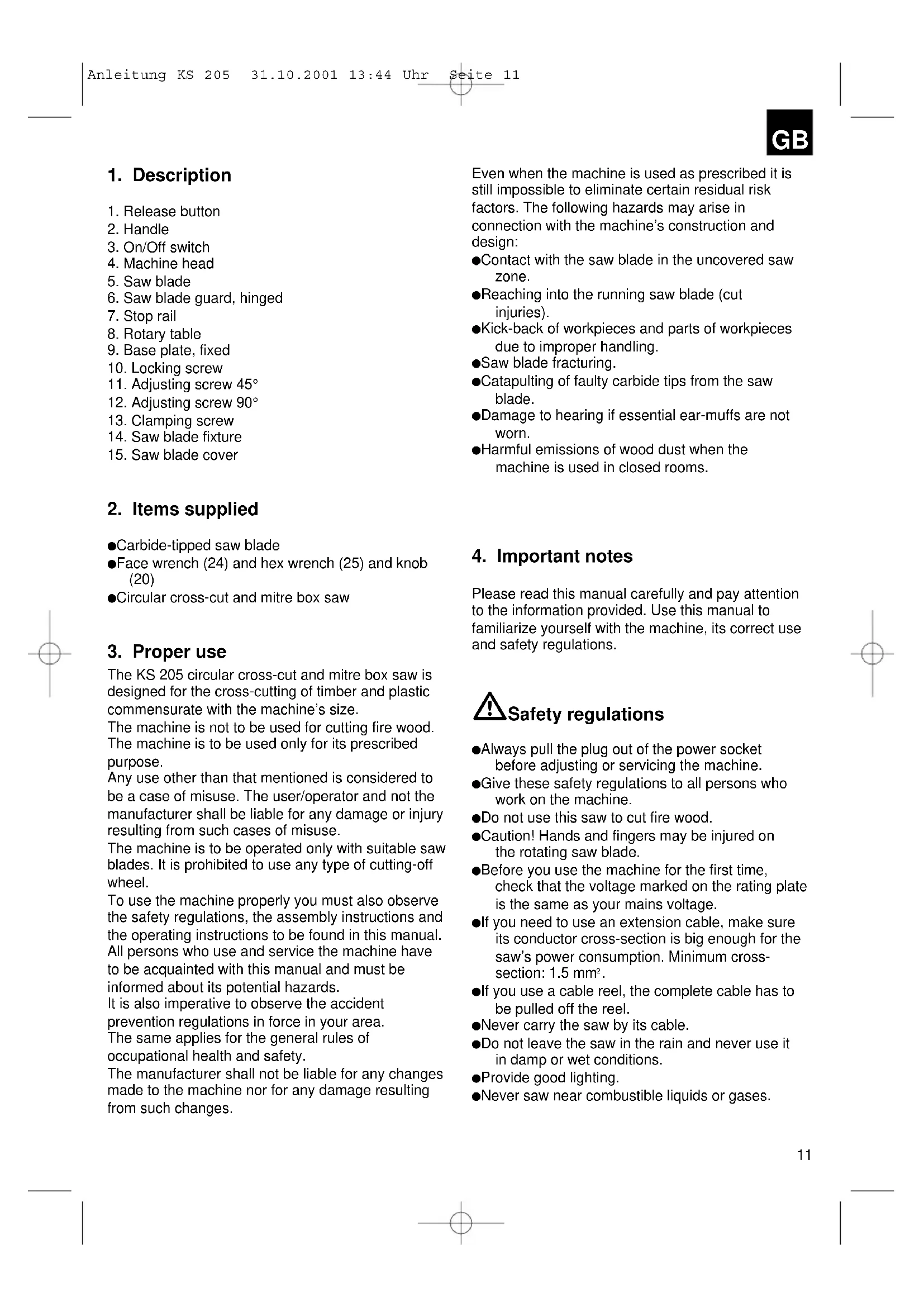 The KS 205 circular cross-cut and mitre box saw is designed for the cross-cutting of timber and plastic commensurate with the machine’s size. The machine is not to be used for cutting fire wood. The machine is to be used only for its prescribed purpose. Any use other than that mentioned is considered to be a case of misuse. The user/operator and not the manufacturer shall be liable for any damage or injury resulting from such cases of misuse. The machine is to be operated only with suitable saw blades. It is prohibited to use any type of cutting-off wheel. To use the machine properly you must also observe the safety regulations, the assembly instructions and the operating instructions to be found in this manual. All persons who use and service the machine have to be acquainted with this manual and must be informed about its potential hazards. It is also imperative to observe the accident prevention regulations in force in your area. The same applies for the general rules of occupational health and safety. The manufacturer shall not be liable for any changes made to the machine nor for any damage resulting from such changes. Even when the machine is used as prescribed it is still impossible to eliminate certain residual risk factors. The following hazards may arise in connection with the machine’s construction and design: Contact with the saw blade in the uncovered saw zone. Reaching into the running saw blade (cut injuries). Kick-back of workpieces and parts of workpieces due to improper handling. Saw blade fracturing. Catapulting of faulty carbide tips from the saw blade. Damage to hearing if essential ear-muffs are not worn. Harmful emissions of wood dust when the machine is used in closed rooms.