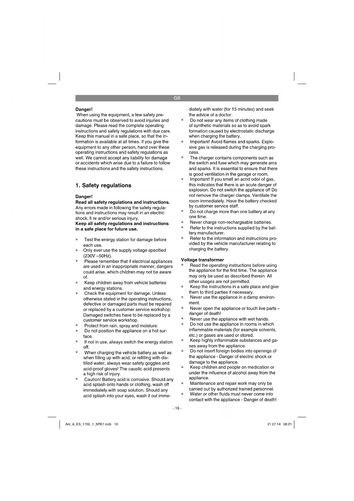 The energy station is NOT designed to start completely discharged batteries! The terminals are insulated to prevent accidental short-circuiting when connecting the terminals to the vehicle’s battery and parts. Short-circuits must be avoided at all costs. The jump-start feature of the energy station off ers a welcome helping hand when having start-up diffi culties because of low battery capacity in the motor vehicle battery. We would like to point out that even standard Anl_A_ES_1700_1_SPK7.indb 19Anl_A_ES_1700_1_SPK7.indb 19 21.07.14 08:2121.07.14 08:21GB