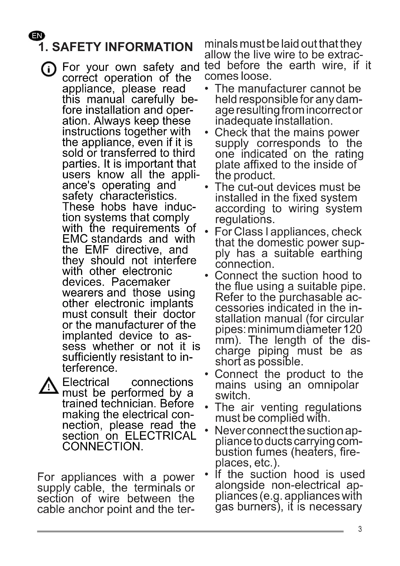 For your own safety and correct operation of the appliance, please read this manual carefully be- fore installation and oper- ation. Always keep these instructions together with the appliance, even if it is sold or transferred to third parties. It is important that users know all the appli- ance's operating and safety characteristics. These hobs have induc- tion systems that comply with the requirements of EMC standards and with the EMF directive, and they should not interfere with other electronic devices. Pacemaker wearers and those using other electronic implants must consult their doctor or the manufacturer of the implanted device to as- sess whether or not it is sufficiently resistant to in- terference. Electrical connections must be performed by a trained technician. Before making the electrical con- nection, please read the section on ELECTRICAL CONNECTION. For appliances with a power supply cable, the terminals or section of wire between the cable anchor point and the ter- minals must be laid out that they allow the live wire to be extrac- ted before the earth wire, if it comes loose.