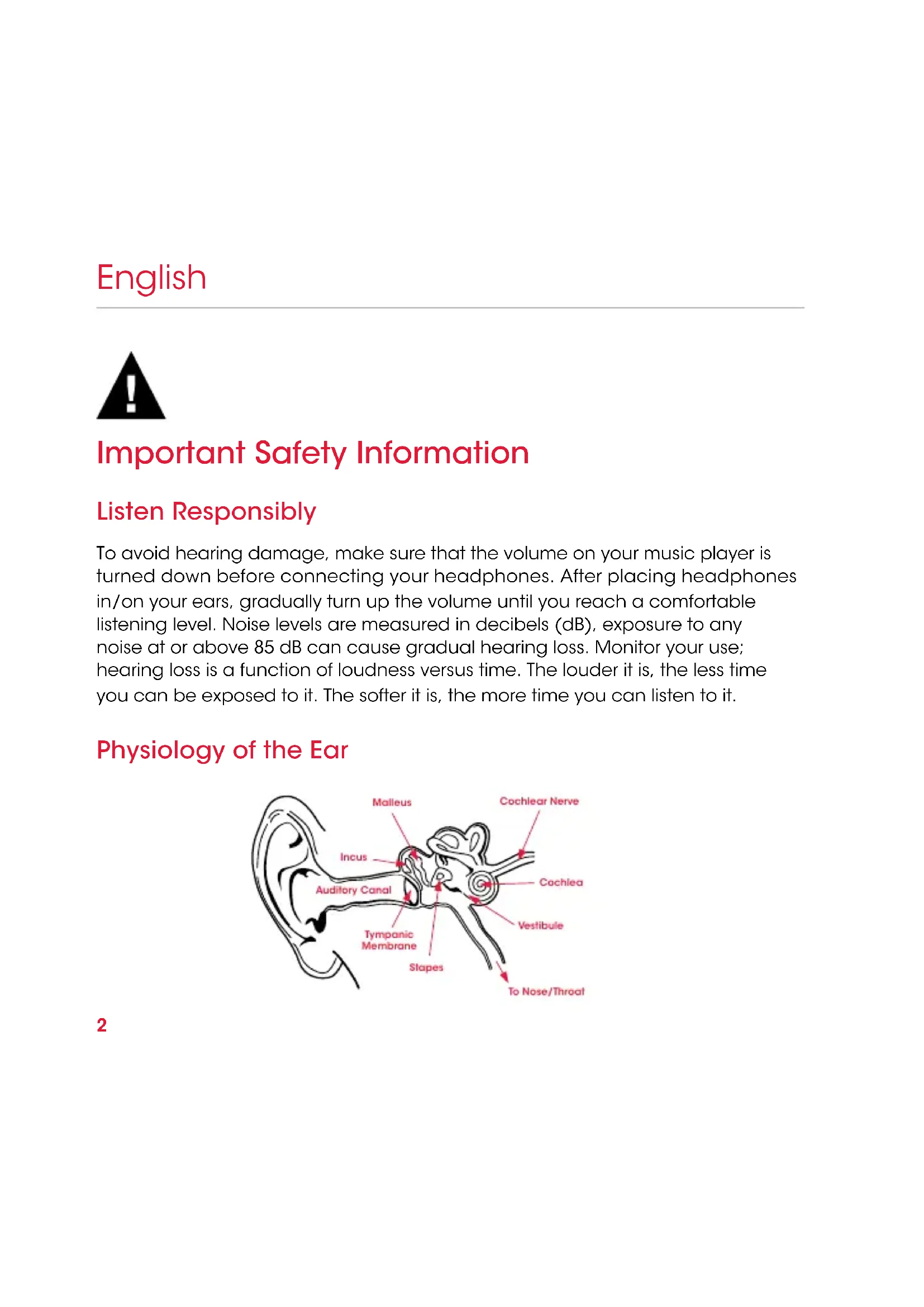 - Chart information from http://www.nidcd.nih.gov/health/education/teachers/pages/common_sounds.aspx English This decibel (dB) table compares some common sounds and shows how they rank in potential harm to hearing.4 English “…. a typical person can safely listen to an iPod for 4.6 hours per day at 70% volume.” “…. knowing the levels one is listening to music at, and for how long is extremely important.” From http://www.cbc.ca/health/story/2006/10/19/music-earphones.html Get the most out of your equipment and enjoy great audio performance even at safe levels. Our headphones will allow you to hear more details at lower volume levels than ever before. Use Responsibly Do not use headphones when it’s unsafe to do so—while operating a vehicle, crossing streets, or during any activity or in an environment where your full attention to your surroundings is required. It’s dangerous to drive while wearing headphones, and in many places, illegal because it decreases your chances of hearing life-saving sounds outside of your vehicle, such as another car’s horn and emergency vehicle sirens. Please avoid wearing your headphones while driving. Use an FM transmitter to listen to your mobile media devices instead. Learn how to establish a safe listening level and review other important safety guidelines from the Consumer Electronics Association at www.ce.org and the Deafness Research Foundation at www.drf.org.5 Eartips and Maintenance Eartip Selection The tips on the ends of urBeats