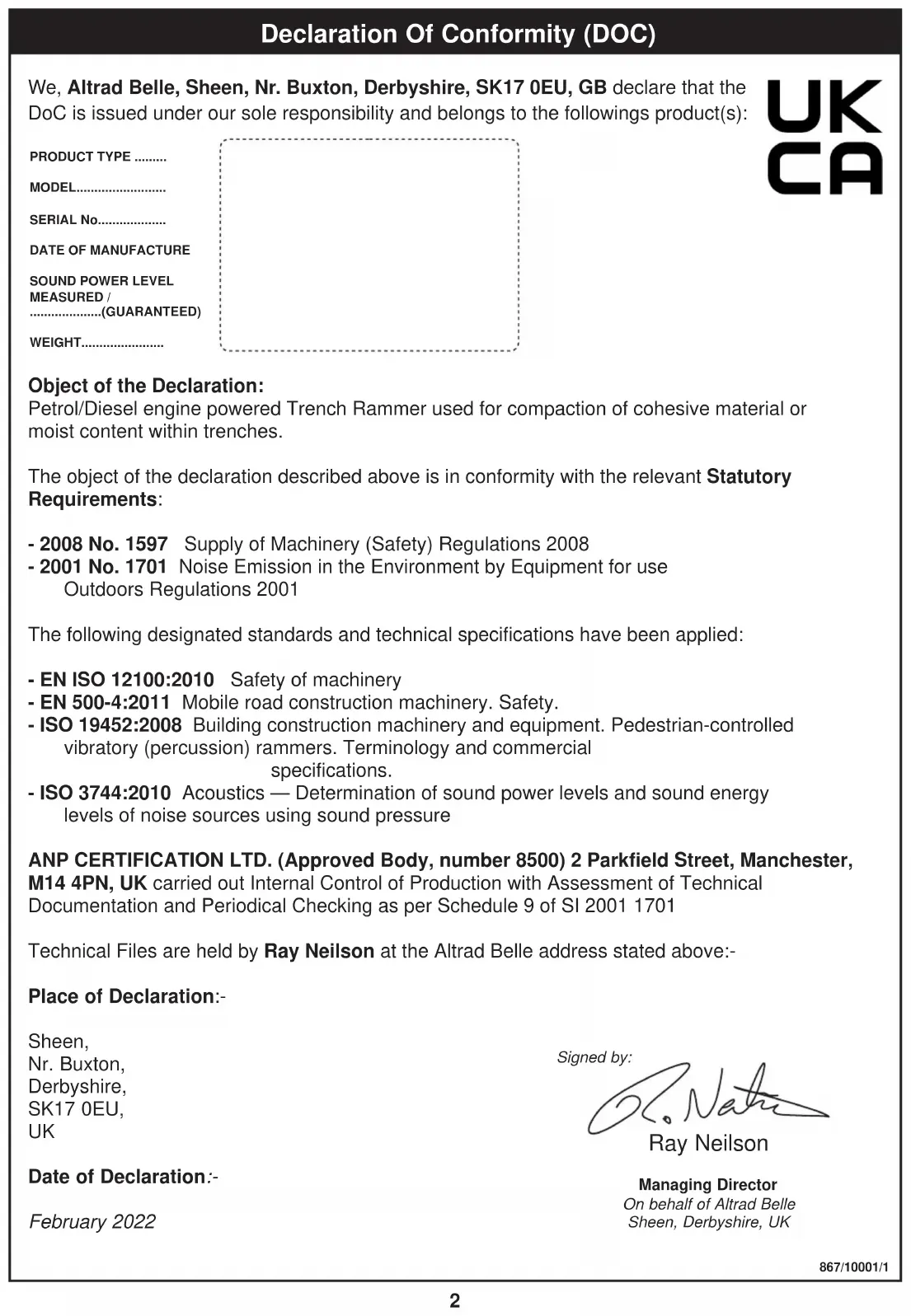 Managing DirectorOn behalf of Altrad BelleSheen, Derbyshire, UK EC Declaration Of Conformity (DOC) Ray Neilson Signed by: We, Altrad Belle, Sheen, Nr. Buxton, Derbyshire, SK17 0EU, GB declare that the DoC is issued under our sole responsibility and belongs to the followings product(s): 866/10001/0_GB GB GB PRODUCT TYPE .....................MODEL.....................................SERIAL No...............................DATE OF MANUFACTURE.....SOUND POWER LEVELMEASURED /....................(GUARANTEED)WEIGHT................................... Object of the Declaration: Petrol/Diesel engine powered Trench Rammer used for compaction of cohesive material or moist content within trenches. The object of the declaration described above is in conformity with the relevant Union Harmonisation Legislation: - 2006/42/EC New machinery directive - 2000/14/EC Noise - equipment for use outdoors The following harmonised standards and technical specifications have been applied: - EN ISO 12100:2010 Safety of machinery - EN 500-4:2011 Mobile road construction machinery. Safety. - ISO 19452:2008 Building construction machinery and equipment. Pedestrian-controlled vibratory (percussion) rammers. Terminology and commercial specifications. - ISO 3744:2010 Acoustics — Determination of sound power levels and sound energy levels of noise sources using sound pressure VINÇOTTE nv/sa (NB0026) carried out Internal Control of Production with Assessment of Technical Documentation and Periodical Checking as per Annex VI of 2000/14/EC Technical Files are held by Hugues Menager at the following address:- Altrad (Group Holding), 125 Rue du Mas Carbonnier, 34000, Montpellier, France. Place of Declaration:- Sheen, Nr. Buxton, Derbyshire, SK17 0EU,