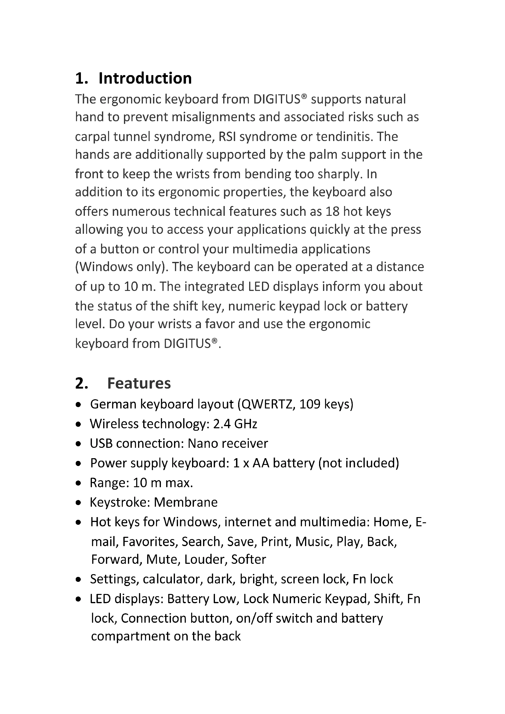 Quick Installation Guide DA-201571. Introduction The ergonomic keyboard from DIGITUS® supports natural hand to prevent misalignments and associated risks such as carpal tunnel syndrome, RSI syndrome or tendinitis. The hands are additionally supported by the palm support in the front to keep the wrists from bending too sharply. In addition to its ergonomic properties, the keyboard also offers numerous technical features such as 18 hot keys allowing you to access your applications quickly at the press of a button or control your multimedia applications (Windows only). The keyboard can be operated at a distance of up to 10 m. The integrated LED displays inform you about the status of the shift key, numeric keypad lock or battery level. Do your wrists a favor and use the ergonomic keyboard from DIGITUS®.