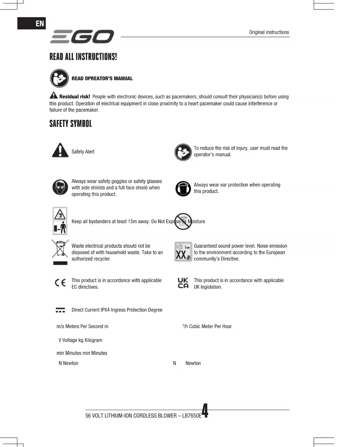 Guaranteed sound power level. Noise emission to the environment according to the European community’s Directive.This product is in accordance with applicable EC directives.This product is in accordance with applicable UK legislation.Direct Current IPX4 Ingress Protection Degreem/s Meters Per Second m /h Cubic Meter Per HourV Voltage kg Kilogrammin Minutes min MinutesN Newton N NewtonOriginal instructions56 VOLT LITHIUM-ION CORDLESS BLOWER – LB7650E 5