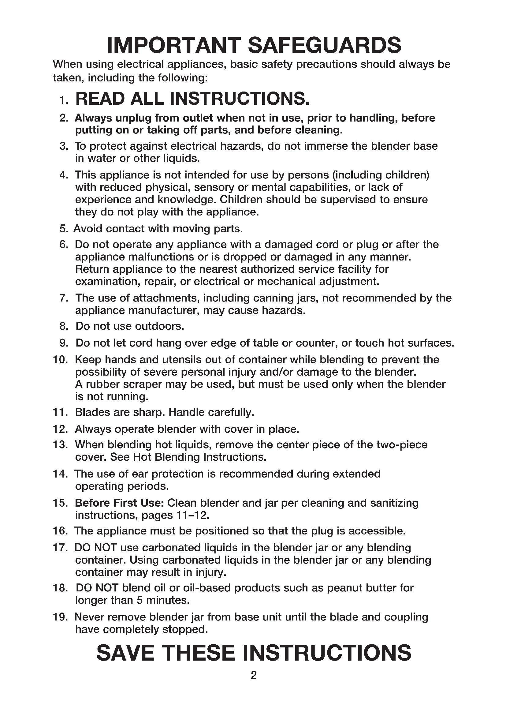 17. DO NOT use carbonated liquids in the blender jar or any blending
