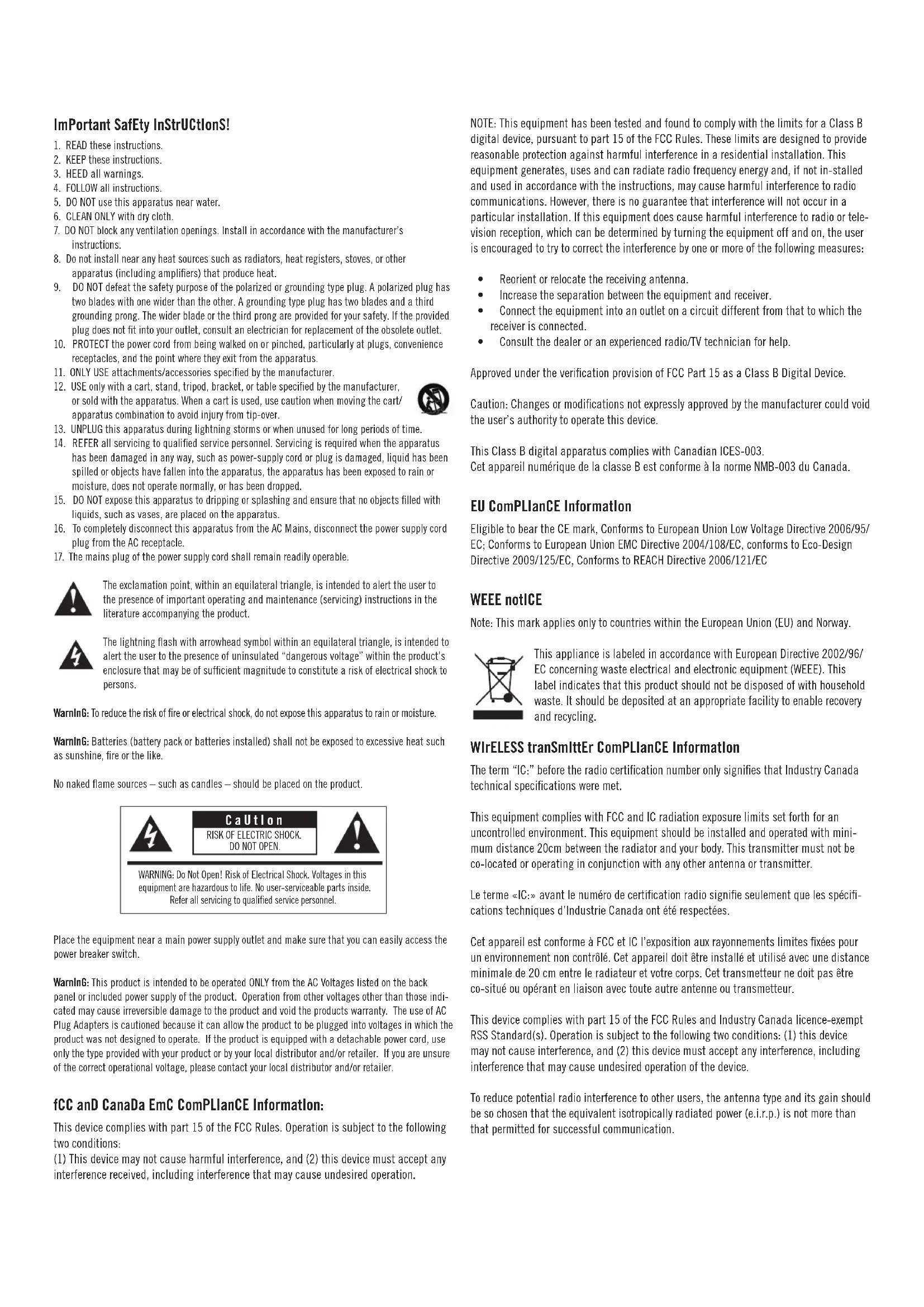- Consult the dealer or an experienced radio/TV technician for help. Approved under the verification provision of FCC Part 15 as a Class B Digital Device. Caution: Changes or modifications not expressly approved by the manufacturer could void the user’s authority to operate this device. This Class B digital apparatus complies with Canadian ICES-003. Cet appareil numérique de la classe B est conforme à la norme NMB-003 du Canada. EU ComPLIanCE InformatIon Eligible to bear the CE mark, Conforms to European Union Low Voltage Directive 2006/95/ EC; Conforms to European Union EMC Directive 2004/108/EC, conforms to Eco-Design Directive 2009/125/EC, Conforms to REACH Directive 2006/121/EC WEEE notICE Note: This mark applies only to countries within the European Union (EU) and Norway. This appliance is labeled in accordance with European Directive 2002/96/ EC concerning waste electrical and electronic equipment (WEEE). This label indicates that this product should not be disposed of with household waste. It should be deposited at an appropriate facility to enable recovery and recycling. WIrELESS tranSmIttEr ComPLIanCE InformatIon The term “IC:” before the radio certification number only signifies that Industry Canada technical specifications were met. This equipment complies with FCC and IC radiation exposure limits set forth for an uncontrolled environment. This equipment should be installed and operated with mini- mum distance 20cm between the radiator and your body. This transmitter must not be co-located or operating in conjunction with any other antenna or transmitter. Le terme «IC:» avant le numéro de certification radio signifie seulement que les spécifi- cations techniques d’Industrie Canada ont été respectées. Cet appareil est conforme à FCC et IC l’exposition aux rayonnements limites fixées pour un environnement non contrôlé. Cet appareil doit être installé et utilisé avec une distance minimale de 20 cm entre le radiateur et votre corps. Cet transmetteur ne doit pas être co-situé ou opérant en liaison avec toute autre antenne ou transmetteur. This device complies with part 15 of the FCC Rules and Industry Canada licence-exempt RSS Standard(s). Operation is subject to the following two conditions: (1) this device may not cause interference, and (2) this device must accept any interference, including interference that may cause undesired operation of the device. To reduce potential radio interference to other users, the antenna type and its gain should be so chosen that the equivalent isotropically radiated power (e.i.r.p.) is not more than that permitted for successful communication. CaUtIon RISK OF ELECTRIC SHOCK. DO NOT OPEN.