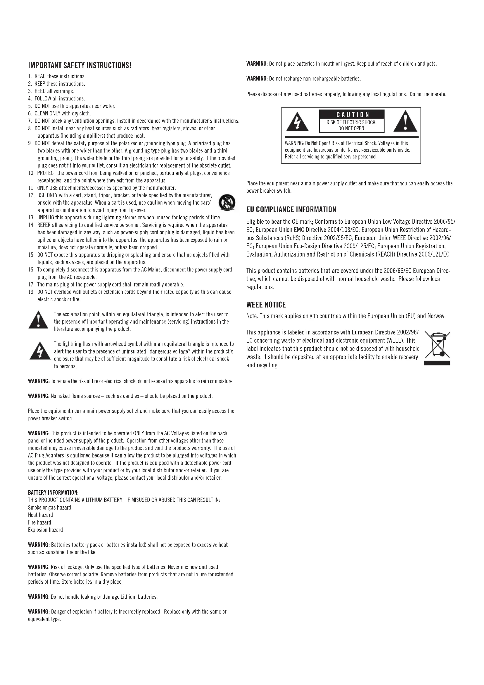 Eligible to bear the CE mark; Conforms to European Union Low Voltage Directive 2006/95/ EC; European Union EMC Directive 2004/108/EC; European Union Restriction of Hazard- ous Substances (RoHS) Directive 2002/95/EC; European Union WEEE Directive 2002/96/ EC; European Union Eco-Design Directive 2009/125/EC; European Union Registration, Evaluation, Authorization and Restriction of Chemicals (REACH) Directive 2006/121/EC This product contains batteries that are covered under the 2006/66/EC European Direc- tive, which cannot be disposed of with normal household waste. Please follow local regulations. WEEE NOTICE Note: This mark applies only to countries within the European Union (EU) and Norway. This appliance is labeled in accordance with European Directive 2002/96/ EC concerning waste of electrical and electronic equipment (WEEE). This label indicates that this product should not be disposed of with household waste. It should be deposited at an appropriate facility to enable recovery and recycling. C A U T I O N RISK OF ELECTRIC SHOCK. DO NOT OPEN.