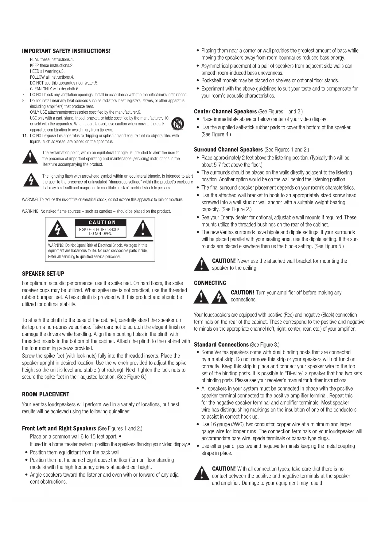 SPEAKER SET-UP For optimum acoustic performance, use the spike feet. On hard floors, the spike receiver cups may be utilized. When spike use is not practical, use the threaded rubber bumper feet. A base plinth is provided with this product and should be utilized for optimal stability. To attach the plinth to the base of the cabinet, carefully stand the speaker on its top on a non-abrasive surface. Take care not to scratch the elegant finish or damage the drivers while handling. Align the mounting holes in the plinth with threaded inserts in the bottom of the cabinet. Attach the plinth to the cabinet with the four mounting screws provided. Screw the spike feet (with lock nuts) fully into the threaded inserts. Place the speaker upright in desired location. Use the wrench provided to adjust the spike height so the unit is level and stable (not rocking). Next, tighten the lock nuts to secure the spike feet in their adjusted location. (See Figure 6.) ROOM PLACEMENT Your Veritas loudspeakers will perform well in a variety of locations, but best results will be achieved using the following guidelines: Front Left and Right Speakers (See Figures 1 and 2.) Place on a common wall 6 to 15 feet apart. • If used in a home theater system, position the speakers flanking your video display.• Position them equidistant from the back wall.• Position them at the same height above the floor (for non-floor standing • models) with the high frequency drivers at seated ear height. Angle speakers toward the listener and even with or forward of any adja-• cent obstructions. Placing them near a corner or wall provides the greatest amount of bass while • moving the speakers away from room boundaries reduces bass energy. Asymmetrical placement of a pair of speakers from adjacent side walls can • smooth room-induced bass unevenness. Bookshelf models may be placed on shelves or optional floor stands.• Experiment with the above guidelines to suit your taste and to compensate for • your room’s acoustic characteristics. Center Channel Speakers (See Figures 1 and 2.) Place immediately above or below center of your video display.• Use the supplied self-stick rubber pads to cover the bottom of the speaker. • (See Figure 4.) Surround Channel Speakers (See Figures 1 and 2.) Place approximately 2 feet above the listening position. (Typically this will be • about 5-7 feet above the floor.) The surrounds should be placed on the walls directly adjacent to the listening • position. Another option would be on the wall behind the listening position. The final surround speaker placement depends on your room’s characteristics.• Use the attached wall bracket to hook to an appropriately sized screw head • screwed into a wall stud or wall anchor with a suitable weight bearing capacity. (See Figure 2.) See your Energy dealer for optional, adjustable wall mounts if required. These • mounts utilize the threaded bushings on the rear of the cabinet. The new Veritas surrounds have bipole and dipole settings. If your surrounds • will be placed parallel with your seating area, use the dipole setting. If the sur- rounds are placed elsewhere then us the bipole setting. (See Figure 5.) CAUTION! Never use the attached wall bracket for mounting the speaker to the ceiling! CONNECTING CAUTION! Turn your amplifier off before making any connections. Your loudspeakers are equipped with positive (Red) and negative (Black) connection terminals on the rear of the cabinet. These correspond to the positive and negative terminals on the appropriate channel (left, right, center, rear, etc.) of your amplifier. Standard Connections (See Figure 3.) Some Veritas speakers come with dual binding posts that are connected • by a metal strip. Do not remove this strip or your speakers will not function correctly. Keep this strip in place and connect your speaker wire to the top set of the binding posts. It is possible to “Bi-wire” a speaker that has two sets of binding posts. Please see your receiver’s manual for further instructions. All speakers in your system must be connected in phase with the positive • speaker terminal connected to the positive amplifier terminal. Repeat this for the negative speaker terminal and amplifier terminals. Most speaker wire has distinguishing markings on the insulation of one of the conductors to assist in correct hook up. Use 16 gauge (AWG), two conductor, copper wire at a minimum and larger • gauge wire for longer runs. The connection terminals on your loudspeaker will accommodate bare wire, spade terminals or banana type plugs. Use either pair of positive and negative terminals keeping the metal coupling • straps in place. CAUTION! With all connection types, take care that there is no contact between the positive and negative terminals at the speaker and amplifier. Damage to your equipment may result! CAUTION RISK OF ELECTRIC SHOCK. DO NOT OPEN.WARNING: Do Not Open! Risk of Electrical Shock. Voltages in this equipment are hazardous to life. No user-serviceable parts inside. Refer all servicing to qualified service personnel.Bass Management When using your speakers in a home theater system, consult the owner’s manual of your surround electronics for proper application of bass management settings. As a general rule, compact speakers (Bookshelf, Center Channel and Sur-• rounds) are set to the “Small,” or bass-limited setting. Floorstanding speakers are typically set to the “Large,” or full-range setting.• Also refer to the electronics instructions for adjusting the relative volume levels • of the speakers so they are at the same level when in the listening position.